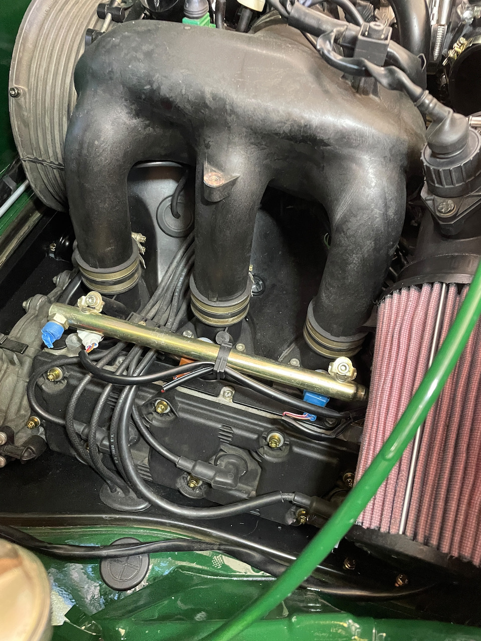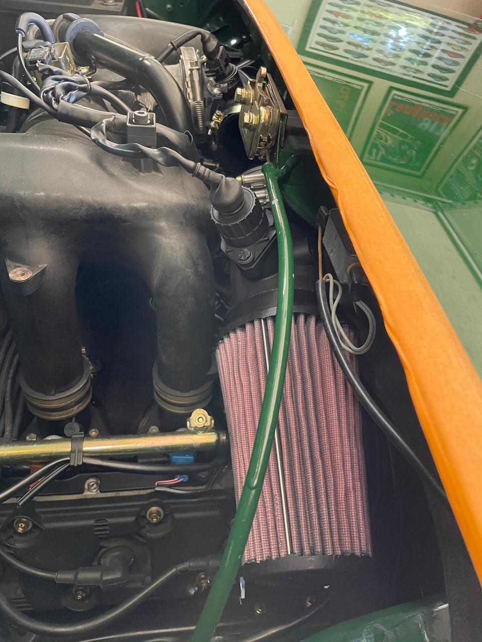 Keep your eyes on that contact area of the cone air filter and fuel-rail end; these cotton/alum screen filters are vulnerable to penetration and deforming when using in tight engine bays. Maybe a soft piece of foam-rubber there ¿