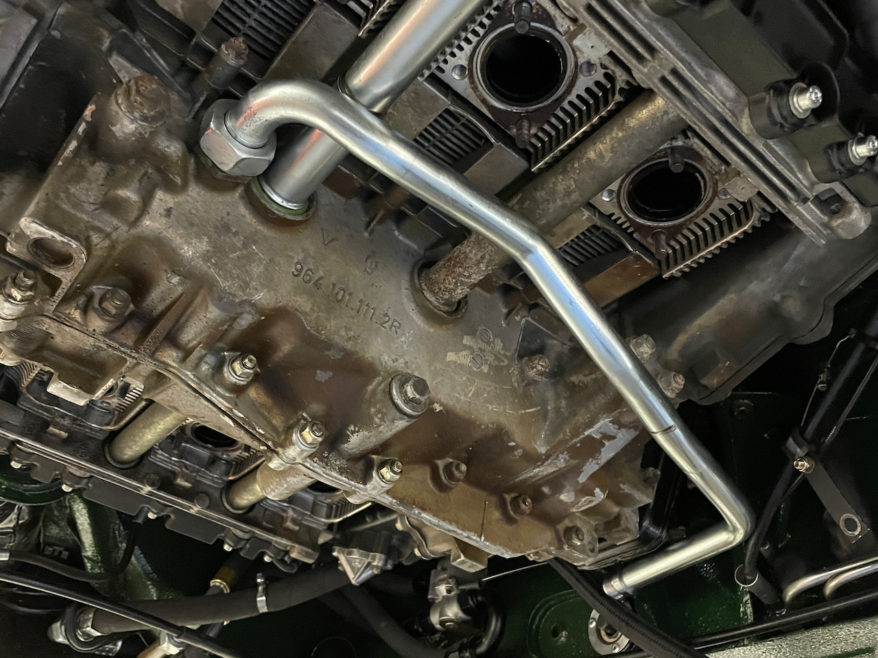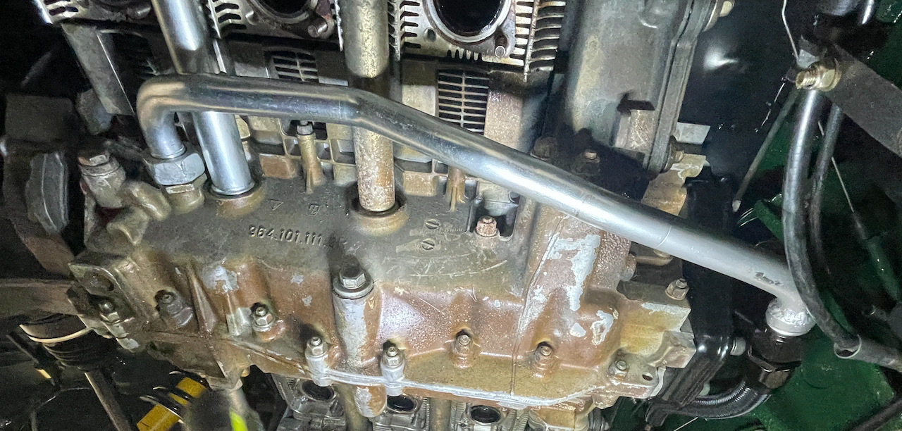 The engine is in the car. It actually slipped right in without much bother. Greg had to loosen the engine tin on passenger side to get her in. We slipped the 993 chassis harness that connects the engine to the chassis in through the firewall in the same spot as the 3.2 harness entered and it fits nicely. Then hooked up both axles just because they were in the way and torqued them properly. Then Greg installed the breather hose from the oil tank filler to the engine.