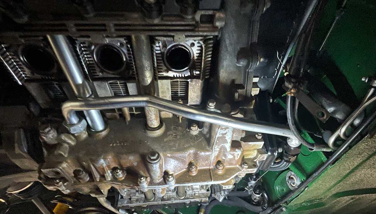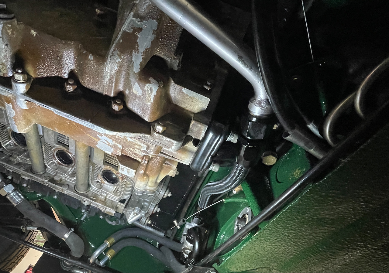 Yesterday was a busy day, but nothing that really photographs well. We got the fuel regulator side of the fuel rails connected but I need to get some proper clamps to complete that- I may have some in my parts stash. Sorry no photos. Please note the bottom of the engine has not really been cleaned as it pretty much lived on my garage floor or Greg's lift table prior to install. All that dirtiness is cosmoline. Once we get everything sorted, I will get to work cleaning it so it looks nicer- although part of me says, "If it has been on the engine since '95, protecting the case, why remove it?" It comes off easy enough as just using a plastic scraper or a finger nail removes it easily.