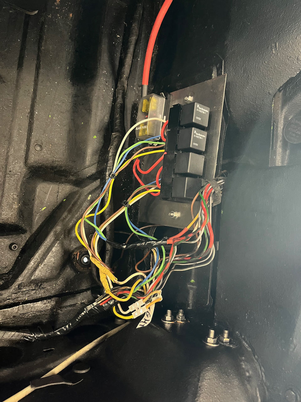 Now before all the wiring material is put away I'm going to set up a dual relay bypass for the headlights up int he frunk somewhere. Not exactly sure how I'll mount those. If anyone has a photo please PM me. I suggest that you buy the JWest 911 headlight relay kit. It will do the same for a 914, but you have to extend the power wire all the way back to the battery. https://www.jwestengineering.com/Early-911-...5-73-_p_15.html Clay, I mounted up two JWest relays as you suggested, tied into to wiring harness right below the drivers side headlight bucket with a little mount. Quite easy in this position. I have some paint work and wire tidying up to do, but I'm very happy with the headlight performance. Much brighter with my C4s. Attached thumbnail(s) |