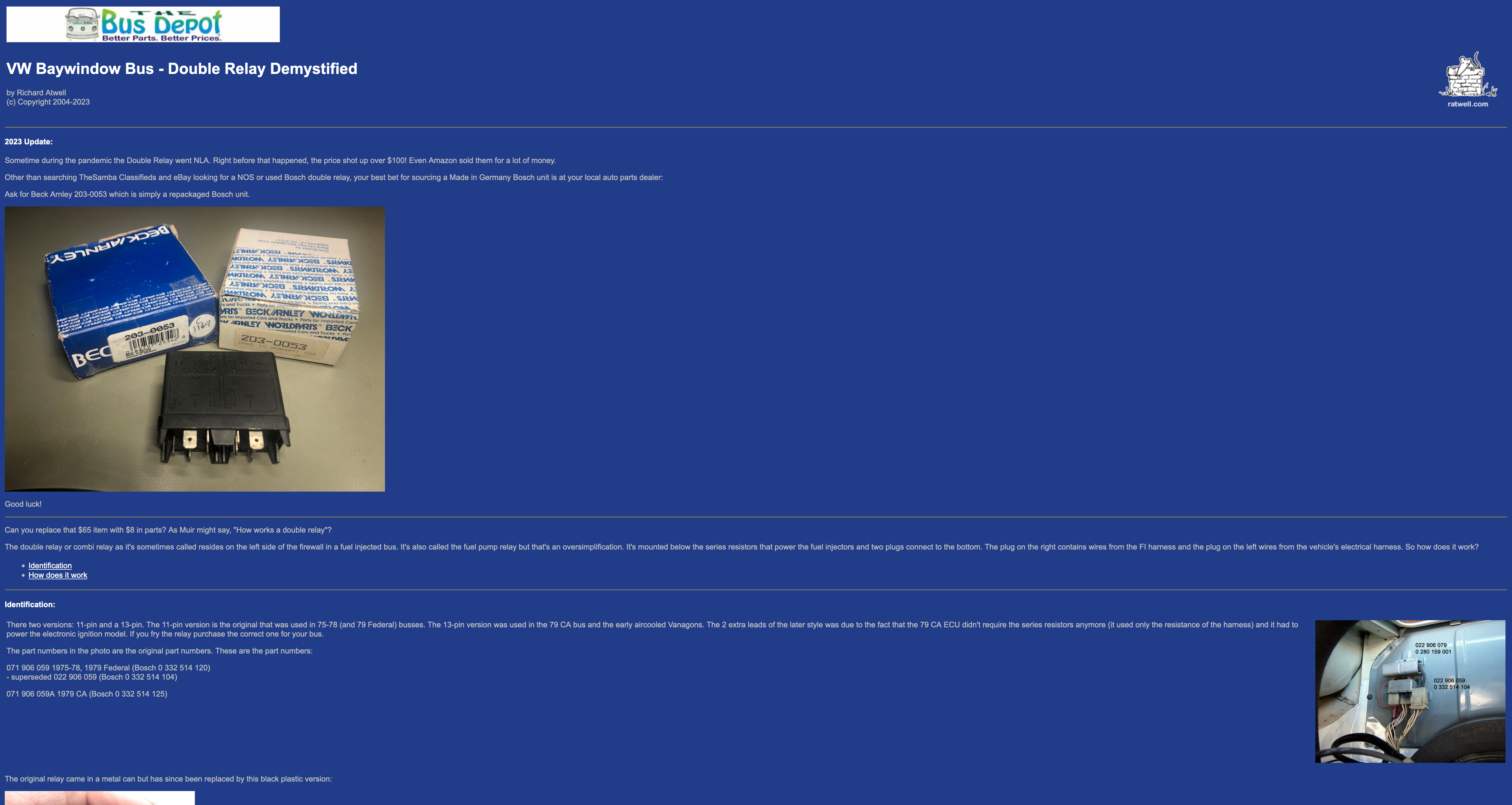 Another part number is Beck/Arnley 203-0053. GO to Ratwell.com He has a section on the diagrams for the relay. Yup, I have already been to Ratwell.com. There are also instructions for using other relays to make this relay. I wasn't aware of the alternative part number, but that is still an NLA relay..... The Bus relay can be used, but you have to change the pin location. That relay is also NLA. I believe Clay Perrine can provide the instructions on how to modify the Bus relay. Trying to put all of this into one place, hopefully repair a few relays, and help others do so. We'll see (IMG:style_emoticons/default/confused24.gif) |