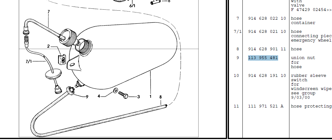 Does anyone know where I can get the nut (113 955 481) that holds the washer fluid line to the bottom of the reservoir? I tried the local Porsche and VW dealerships and nada. The part number comes up in a few places in Europe but I'm hoping it's available in North America. I'd have thought it would be on CiP1 but it didn't come up when I searched there. Here's an image of what comes up under the part number: ![]() Also, does anyone know if the hose at this connection had an expanded end on it so that the nut will hold it onto the nipple? It doesn't look like it in the PET diagram, shown below: Here's an image of my tank with the line on it. It does look like the hose expands over the nipple so does the nut hold it on without a flange on the line because the hose is expanded over nipple? ![]() |