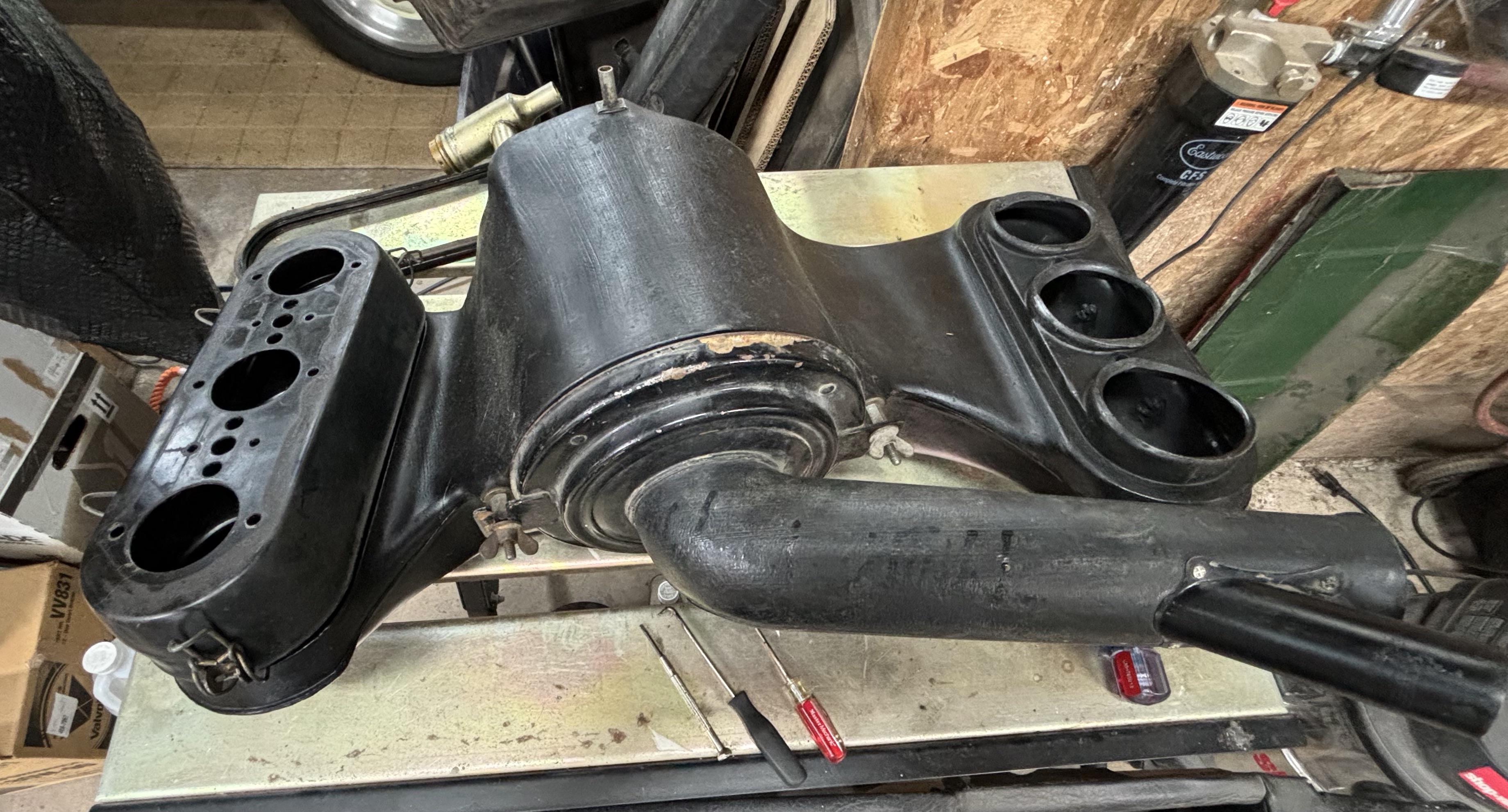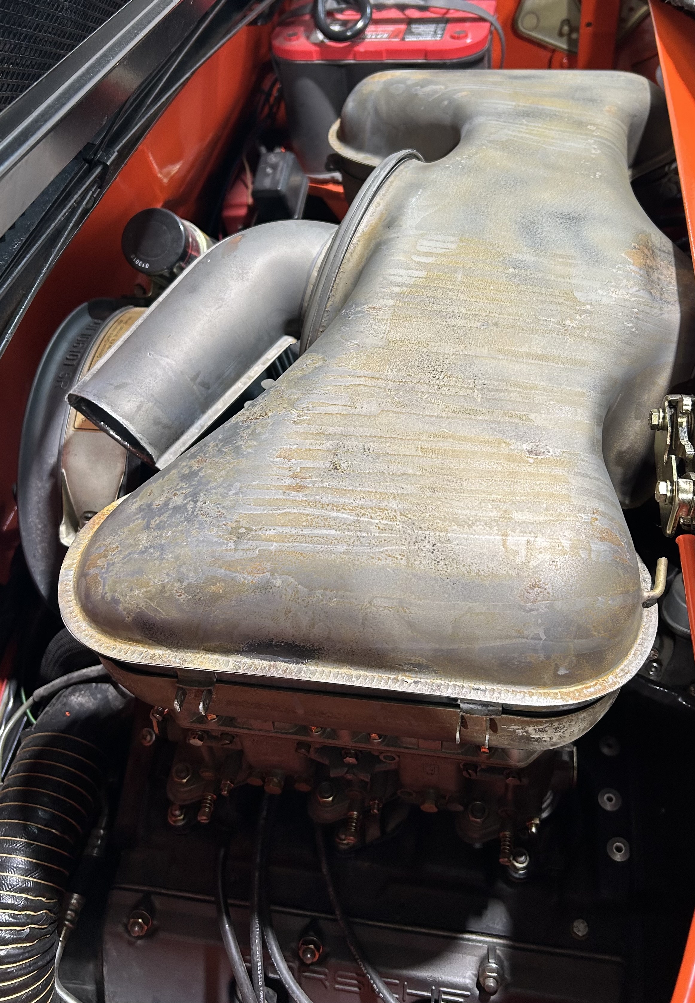 914 6 air filters did. Your snorkel is for a 911 Are the wing nuts plastic ? Fires in the plastic housings were caused by a faulty enrichment system, faulty carbs and faulty maintenance, not by the housing itself. Matt your housing is melted in the round openings for each stack. That's not unusual. Are the mating surfaces flat ? What carburators are you using ? Added pics of a plastic MFI housing. Attached thumbnail(s) |