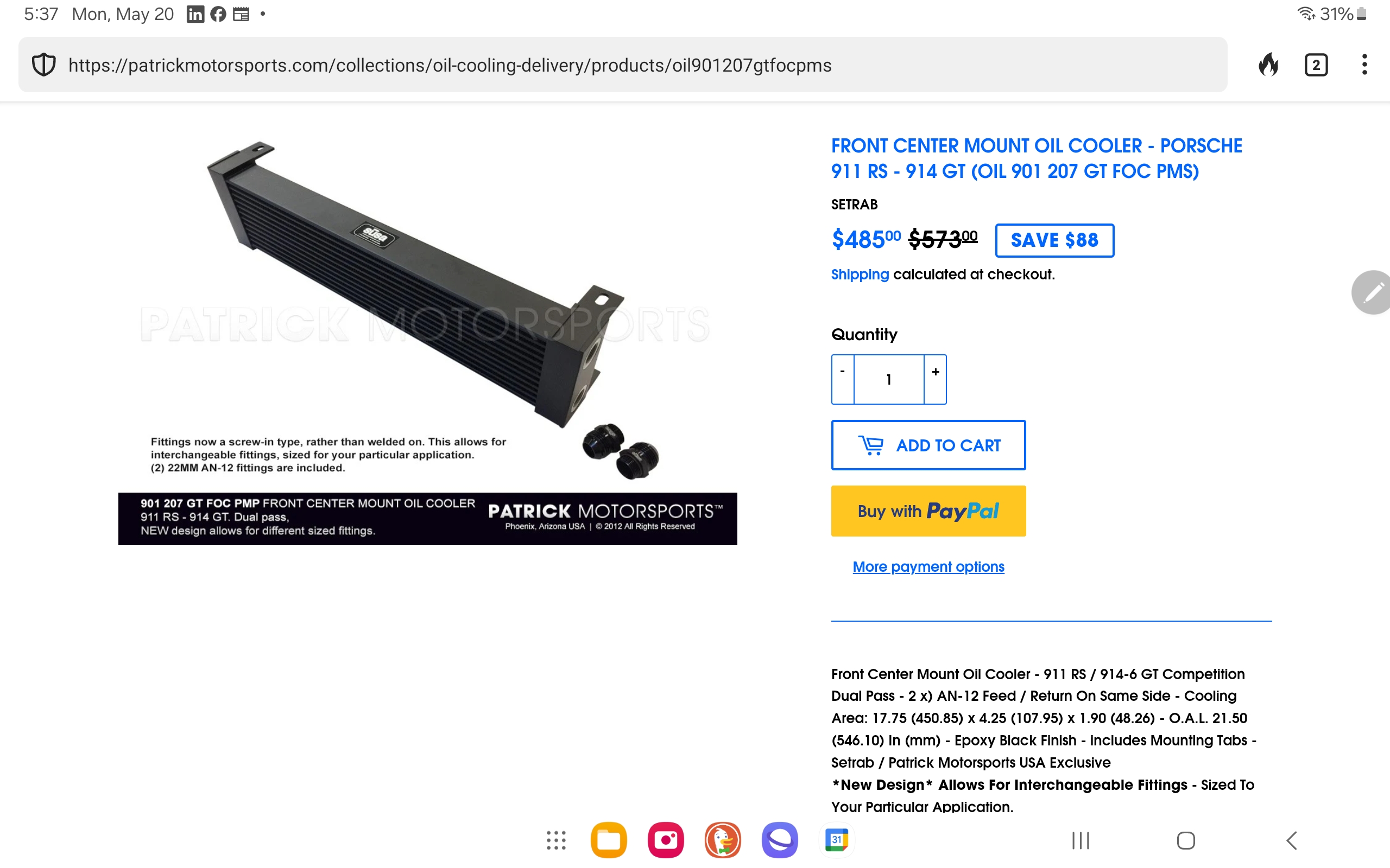 Thanks for the input guys. I'm leaning towards the Setrab Series 9 Dual Pass Dual Fan cooler with 20 rows and 84 square inches of cooling area. Hoping that with the fans it will be enough for race conditions on a hot track. It's a little narrower than the 911RSR one so it might be a better fit.