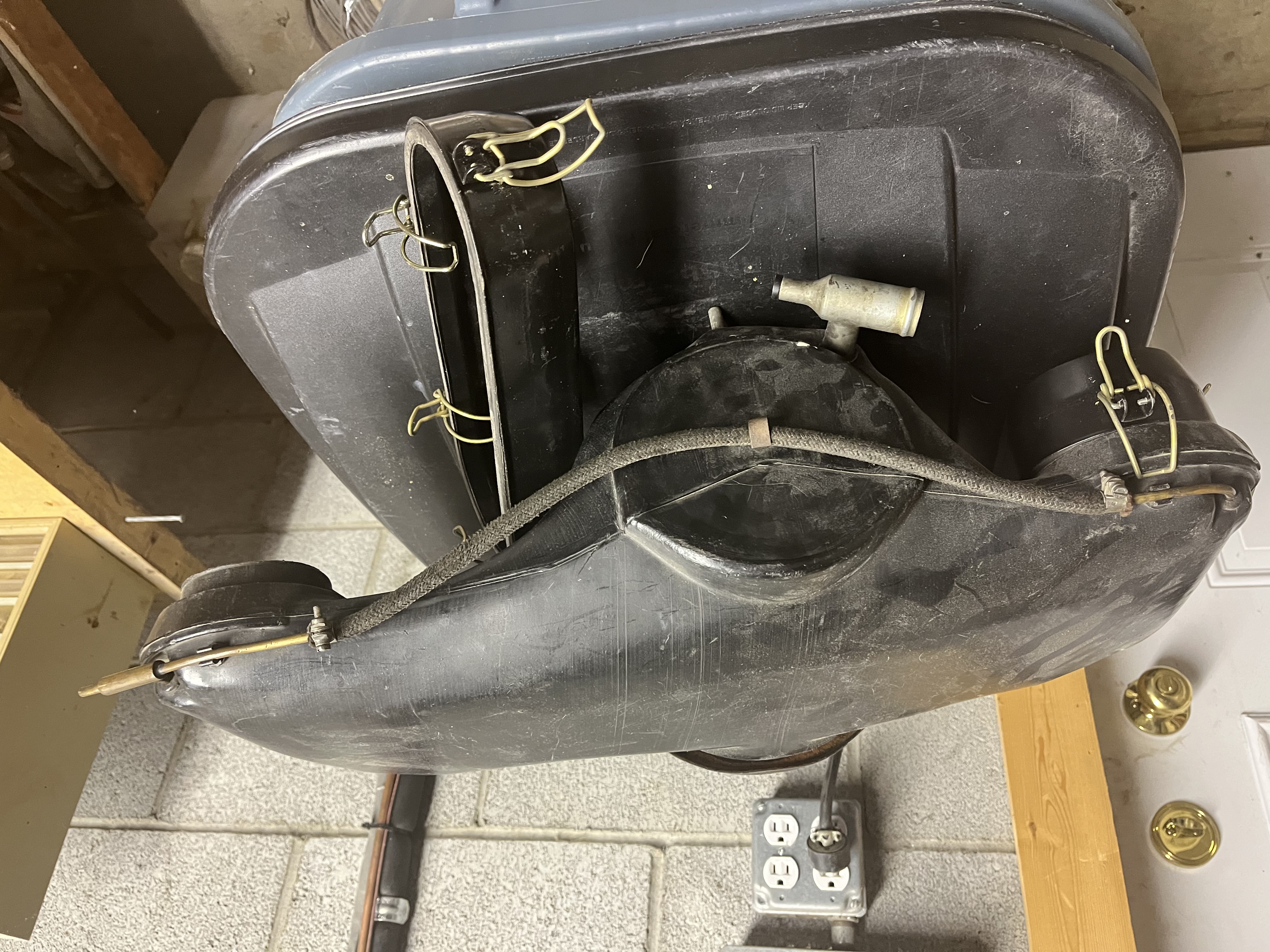 please excuse my gigantic pics I have to do this two at a time. Nice to see Grady Clay mentioned on this site, I visited his shop almost 50 years ago while traveling cross country in a '59 sunroof coupe with my brother and sister. Thats right...three across in a 356. My other sister was in a '69 911 with her future and current husband. I digress. The first two pics show details of the rear of the 6 plastic housing. Notice the drain hose and the metal tube with rubber weep nipple that attaches to the tin near the starter. Also notice the brass T that is plugged on the small side. The large side takes the cloth brided vent hose from the oil tank. There is also a small metal tab that I suspect was meant to hold the small fuel hose that ran across the back of the AF housing. The hose clamps ar incorrect. But they work. Attached thumbnail(s) |