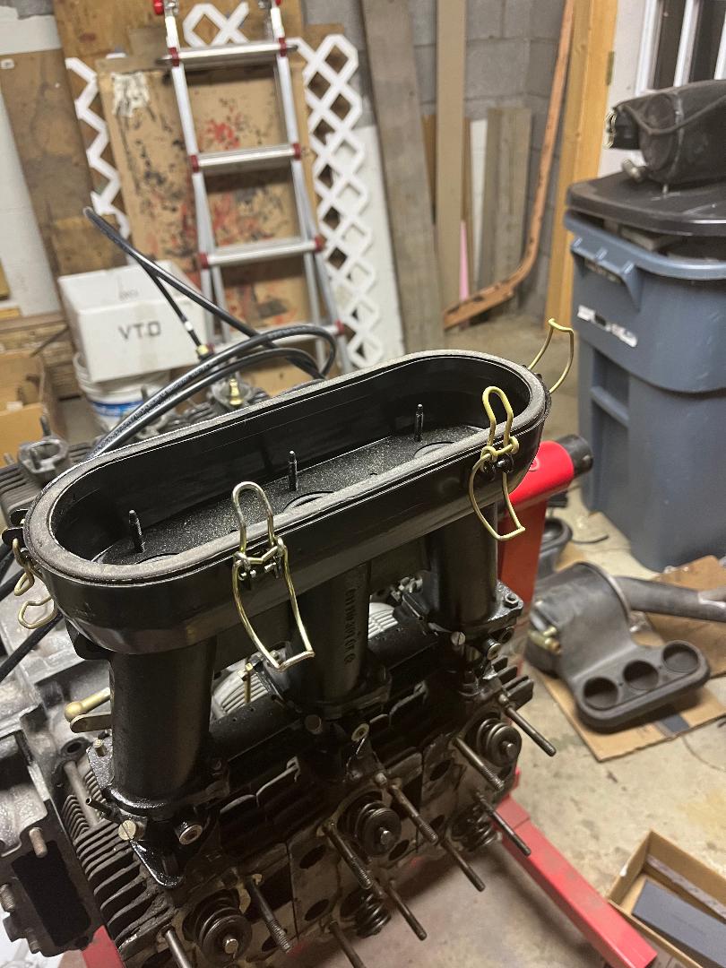Ok, had to make me do it. Just measured the distance between the center line of the rear carb throat to the rear most point on a stock plastic airbox in that area. The distance is 2 1/4". You can measure better the same dimension on your K&N equipped, typical after market filter assembly. I tried quickly on the ones currently on my factory six (without removing the top rain shield, so it is a rough measurement) and I got 2 1/4". Agree the clearance is close here but - Obviously the factory plastic box fits in this area on a factory car. Metal box, who knows - Dont have one to measure. So also does a typical K&N assembly fit. The only way either would not fit here on a conversion is if you are using a motor mount that sets the engine further back. I guess some aftermarket motor mounts may be different, but if they were that far off, then the trans mounts would be off too, and I have never heard of that being an issue with any after market mount. PS... Dont try to install an engine into the car with the passenger side aircleaner mounted, just too close! |