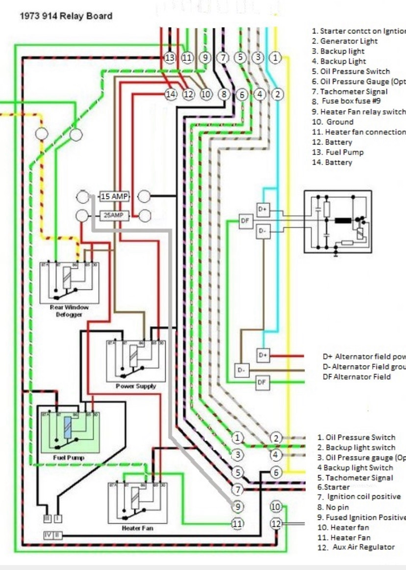 As you probably guessed, I'm left with kind of a mess. I printed out Bowlsby's diagrams for the harnesses and the 12 point plug (which came apart during the removal process) and tested all the connections for continuity and started to put it back on the car. I few things are stumping me right now and here are my questions: - My fuel pump no longer comes on. I looked at the wiring schematic and it shows a fuel pump wire going to the 12 pin harness, pin 12 from pin 13 of the 14 pin harness. That wire is supposed to go to the AAR valve correct? - Is there a wire that goes from the starter to the little box in the engine compartment? It's attached to the side of the trunk and has three posts. On my Mustang it was considered the selonoid, but I'm not sure it's the same on the 914. Do my questions make sense? I have never been good at electrical stuff. I definitely appreciate any assistance and if you want to call me a dummy that's fine too.. - |