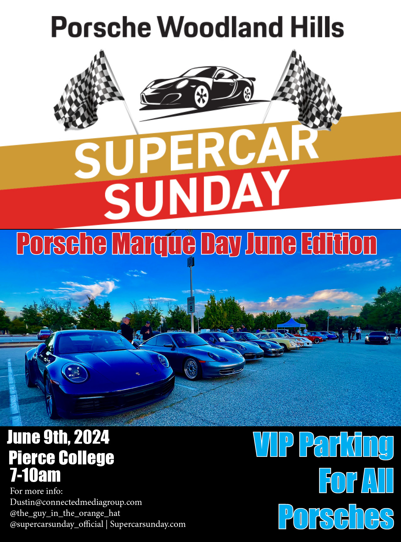 Join us for Porsche Marque Day June Edition! It is going to be epic! Supercar Sunday is presented and sponsored by Porsche Woodland Hills. We expect an incredible showing of Porsches as well as every other type of vehicle imaginable. If you are attending please rsvp with Dustin RSVP: Dustin@connectedmediagroup.com Porsche Marque Day which has become one of the premier monthly Porsche events in Socal continues to amaze! From early air cooled cars to the latest models and modified Porsches and even track cars brought in on trailers... if you are a Porsche enthusiast, you cannot miss the Porsche Marque Days! Please use the Victory Blvd and Mason St. entrance for the show as the physical address takes you to the wrong side of the campus. We are in Parking Lot 7. See you at the show! Dustin |
