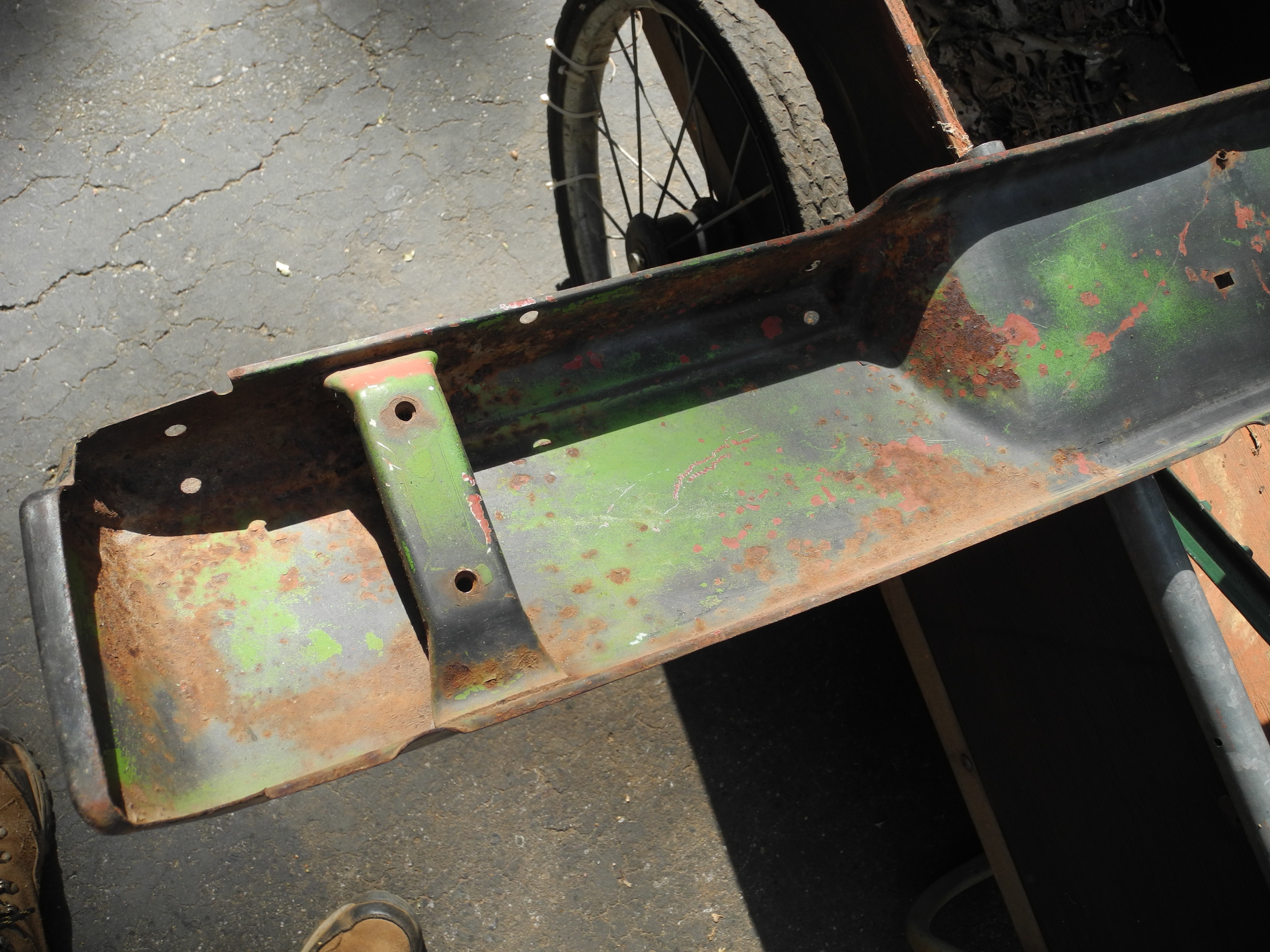 This one will need some work. Some surface rust on the inside. Driver side is where someone will have to do some dolly work and puling (see pictures). Two extra holes to mount the license plate. I chased the mounts and they are good. $100 plus shipping or pick up in Grass Valley CA. Dean |