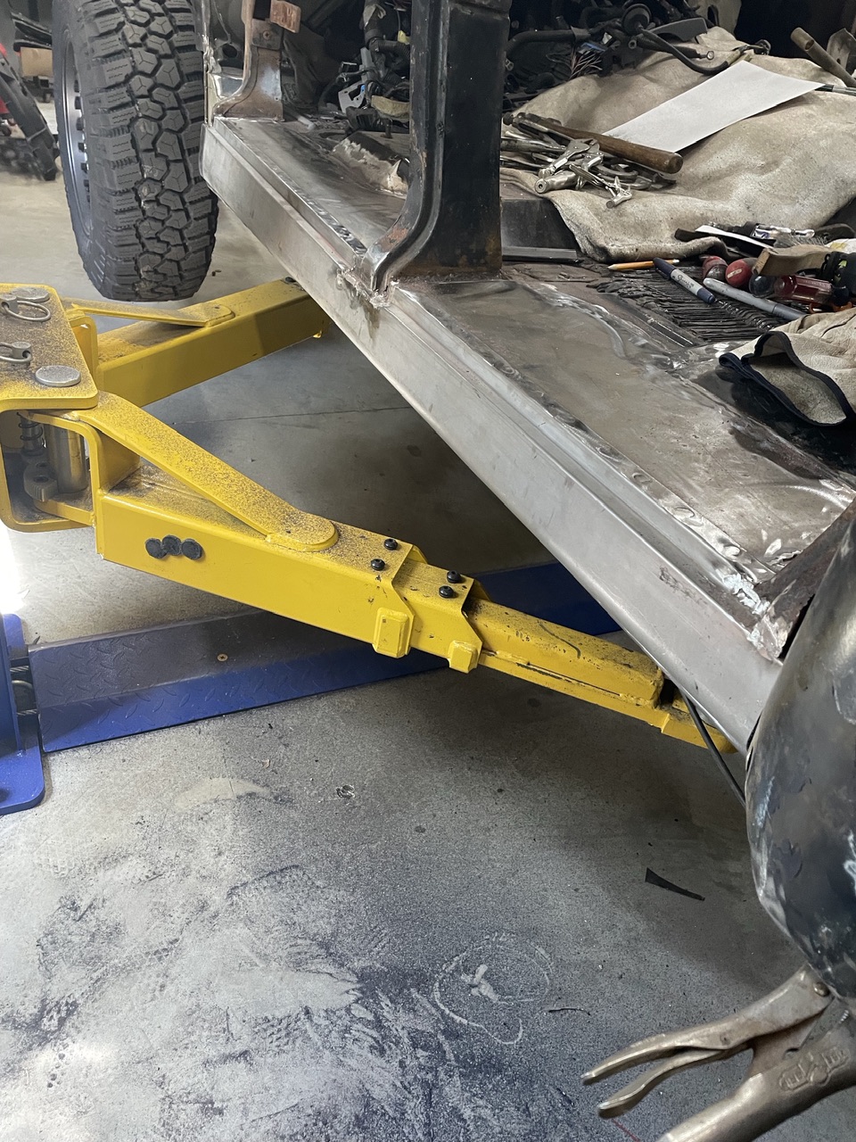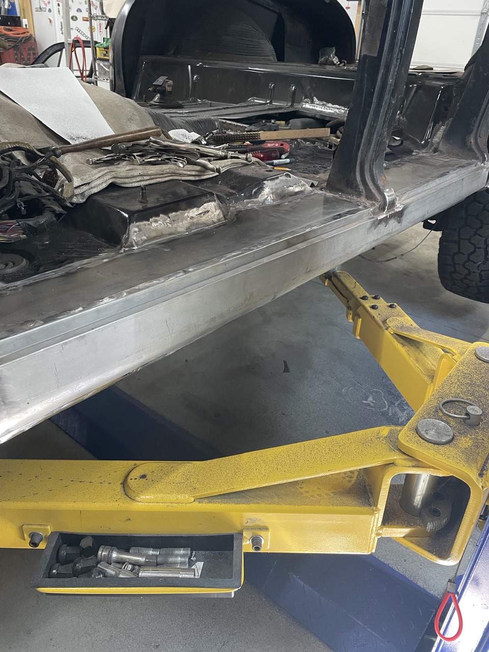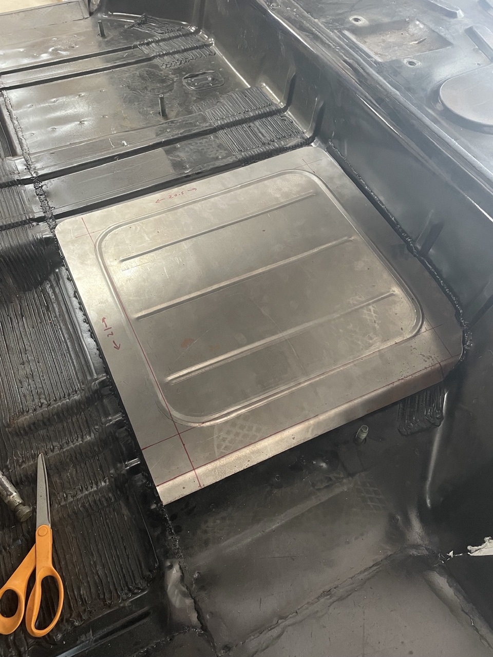 Picked up a new toy, a bead roller. I needed to make an access panel for the fuel tank/pump where I cut the floor out to make the tank fit. I never played with a bead roller before, pretty cool tool. The panel is 18ga and is now nice and strong/rigid. This was my first attempt at using the roller, I’ll get better with more practice, but this panel fits well and will work fine.