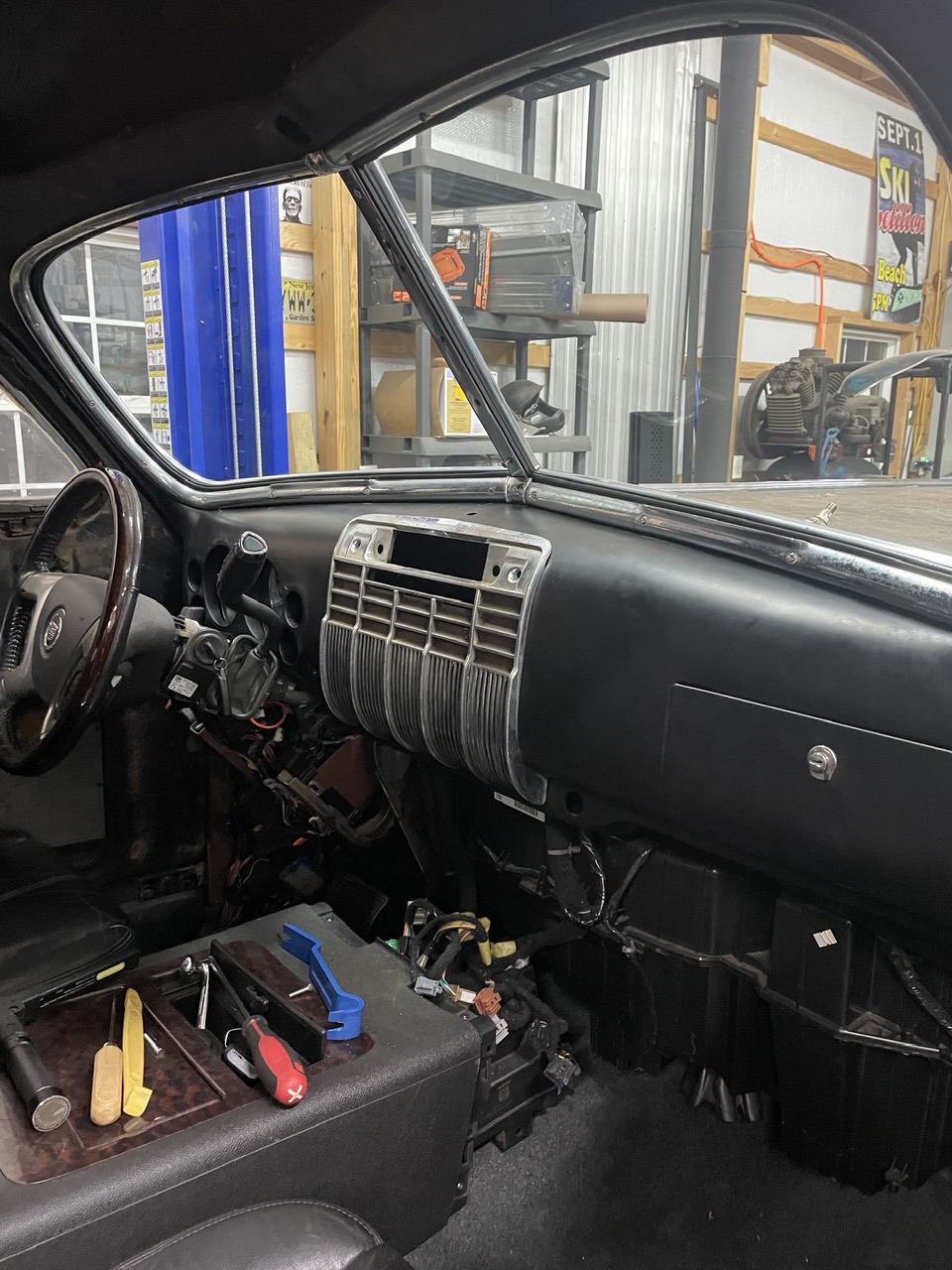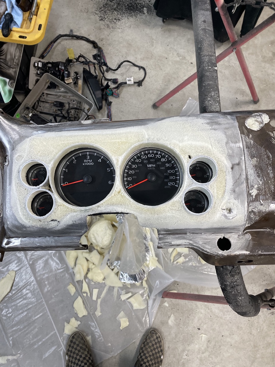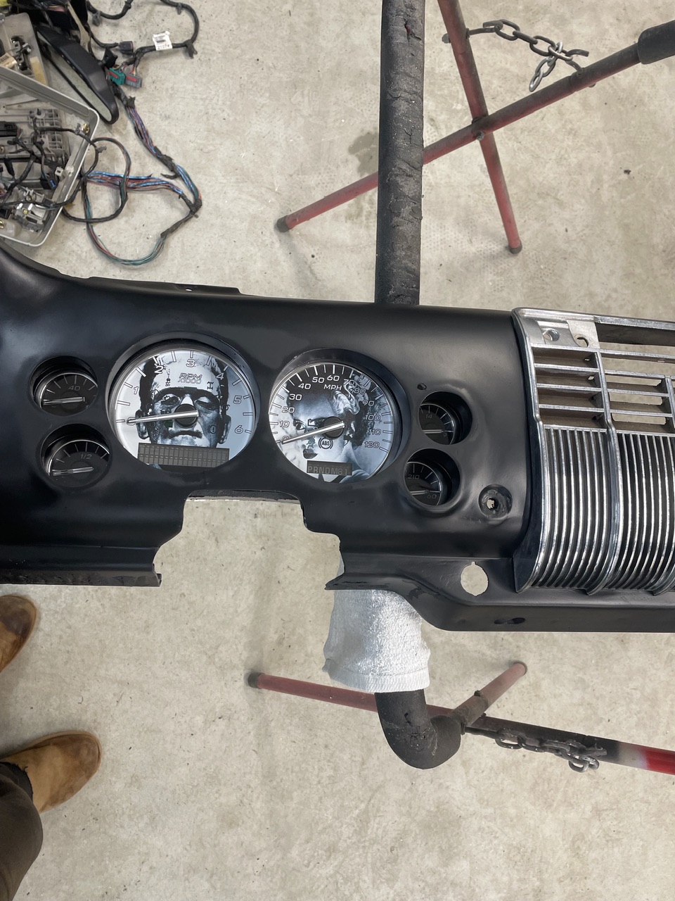 Time for a dash……i wanted to retain all the functionality of the Denali gauge pod but didn’t want the modern look of a gauge pod. I made the dash with openings that align with each of the 6 gauges in the pod to make it look more like classic steam type gauges. I also worked with a company who does custom gauge overlays to create an overlay with Frankenstein and the Bride for the speedo and tach. All my shop creations get a Frankenstein incorporated somewhere (IMG:style_emoticons/default/smile.gif)