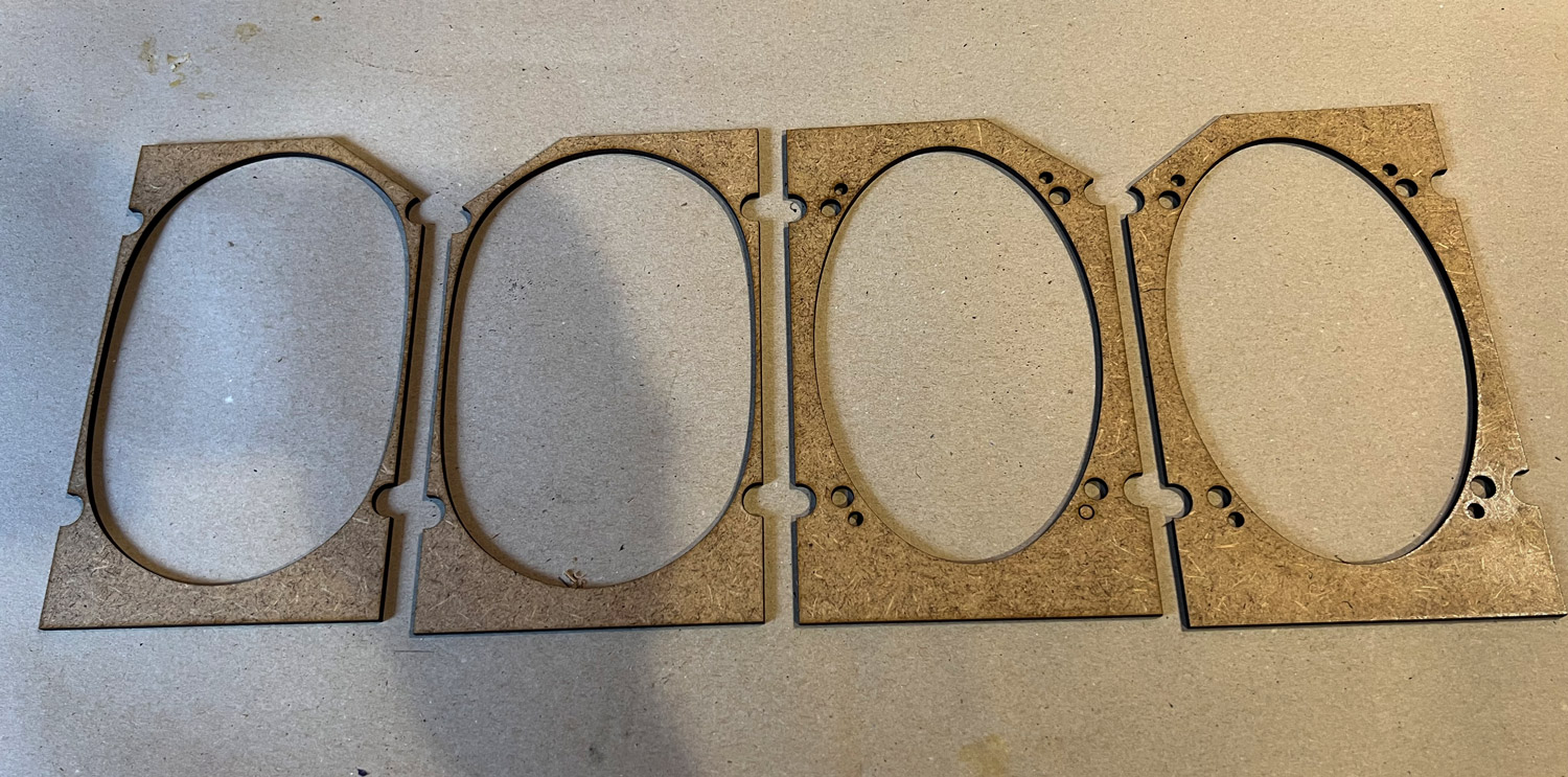 @chmillman but I believe your 6x9 will but out decent bass as compared to my Polk Audio with 4 inch bass and tweeter. They're actually coax 4x6 inchers, not 6x9's. Maybe a little more low-mid cone surface area than your pure 4" PA's, I don't know... Probably not that much difference. Will report back on the sound once I get the subwoofer installed. I was actually thinking of creating the 3D CAD file to make the adapters via 3D printing and just posting that... It was a tossup whether to laser cut or 3D print the parts (I have access to both), the laser cutting was just faster. |