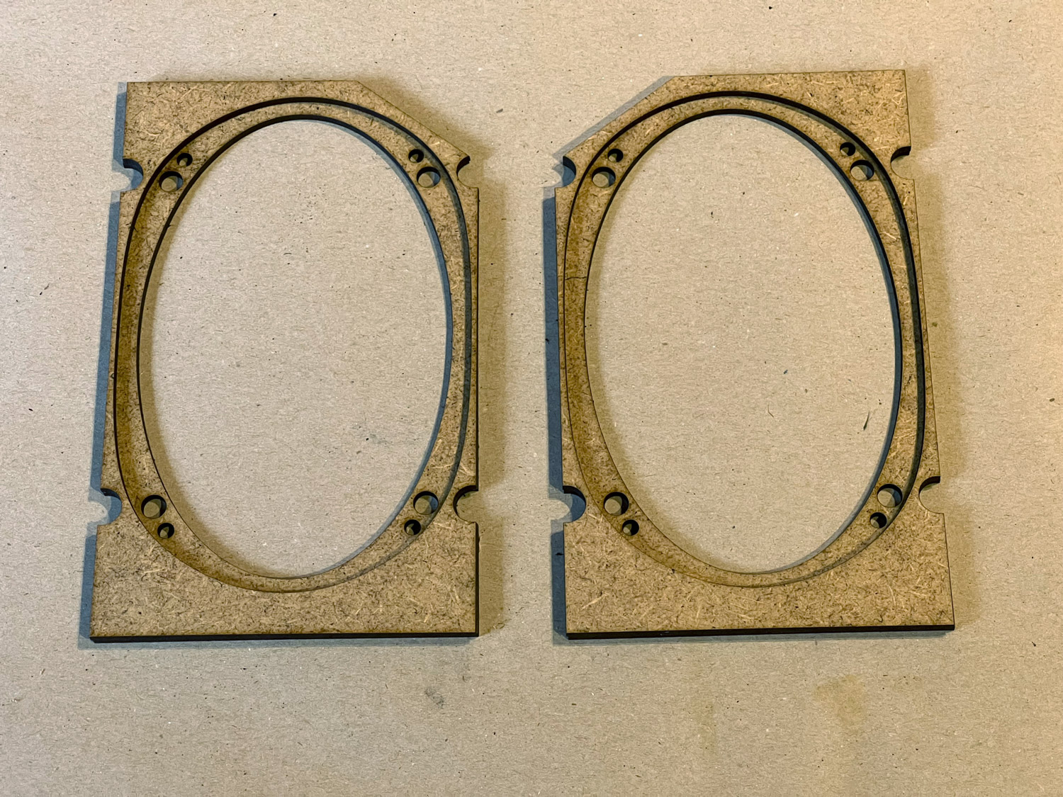 Here are 2D CAD (DXF) files for the laser cutting. Of course, they are custom for the JBL's. The main parts are in 3mm (1/8") MDF, the reinforcements which I glued on the back are in 4mm, they provide the bearing surface for the washers using the the original screw holes. You could also do them in 3mm - just might need an extra washer when installing.