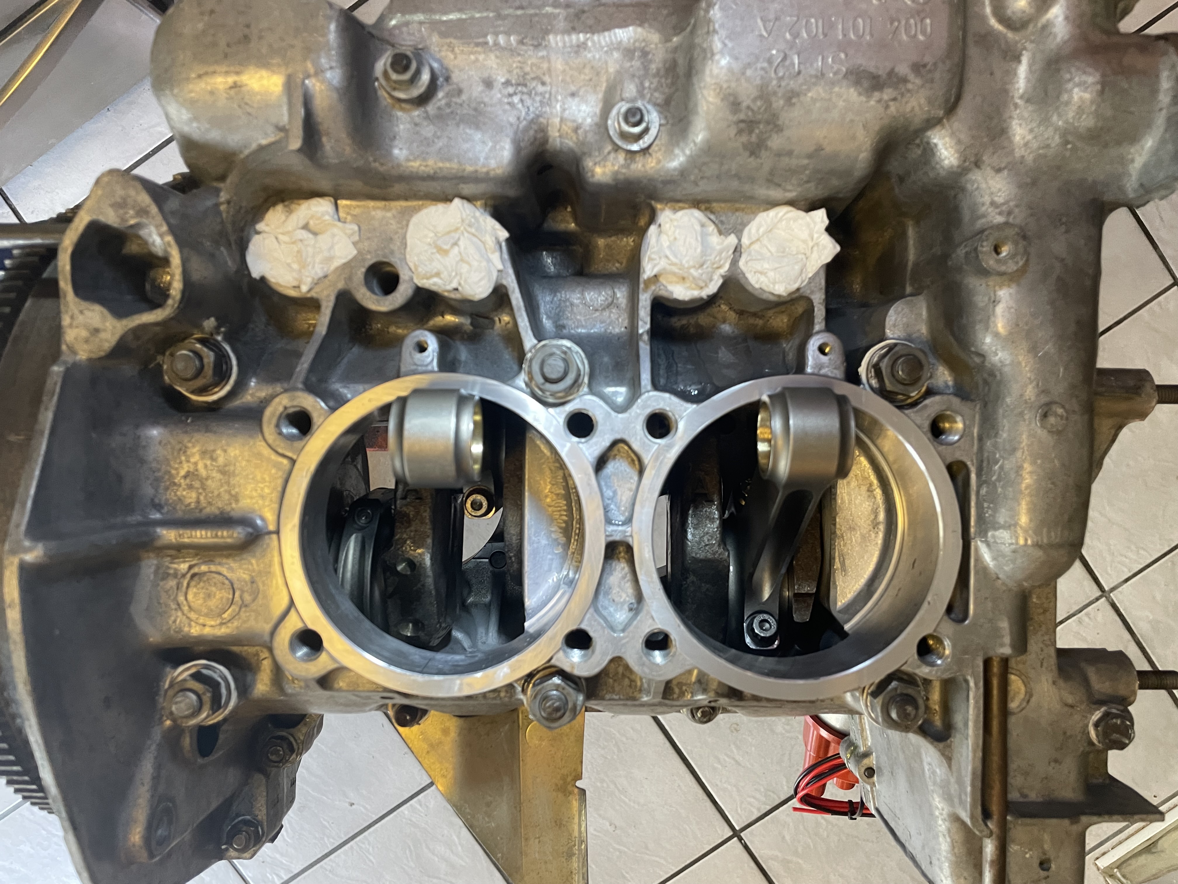 You want them flat (the glass and abrasive probably can get you there). You want them parallel to the crank centerline. You want the decks on both case halfs the same distance from the crank centerline. As a bonus, the material removed will decrease your deck height and increase your compression ratio, which is what you said you are looking for. (If the cleanup cuts ends up farther than you want for your calculated CR, you can add the right sized spacers to dial-in the CR. It looks like you've already glued the case half together, but just suggesting you might be happier knowing the motor is as good as you can make it. That's a sunk cost and it's still easy enough to pull apart and send to a good machinist. The combustion chambers will also likely seal up better and longer if the parts are machined as good as you can get them. |