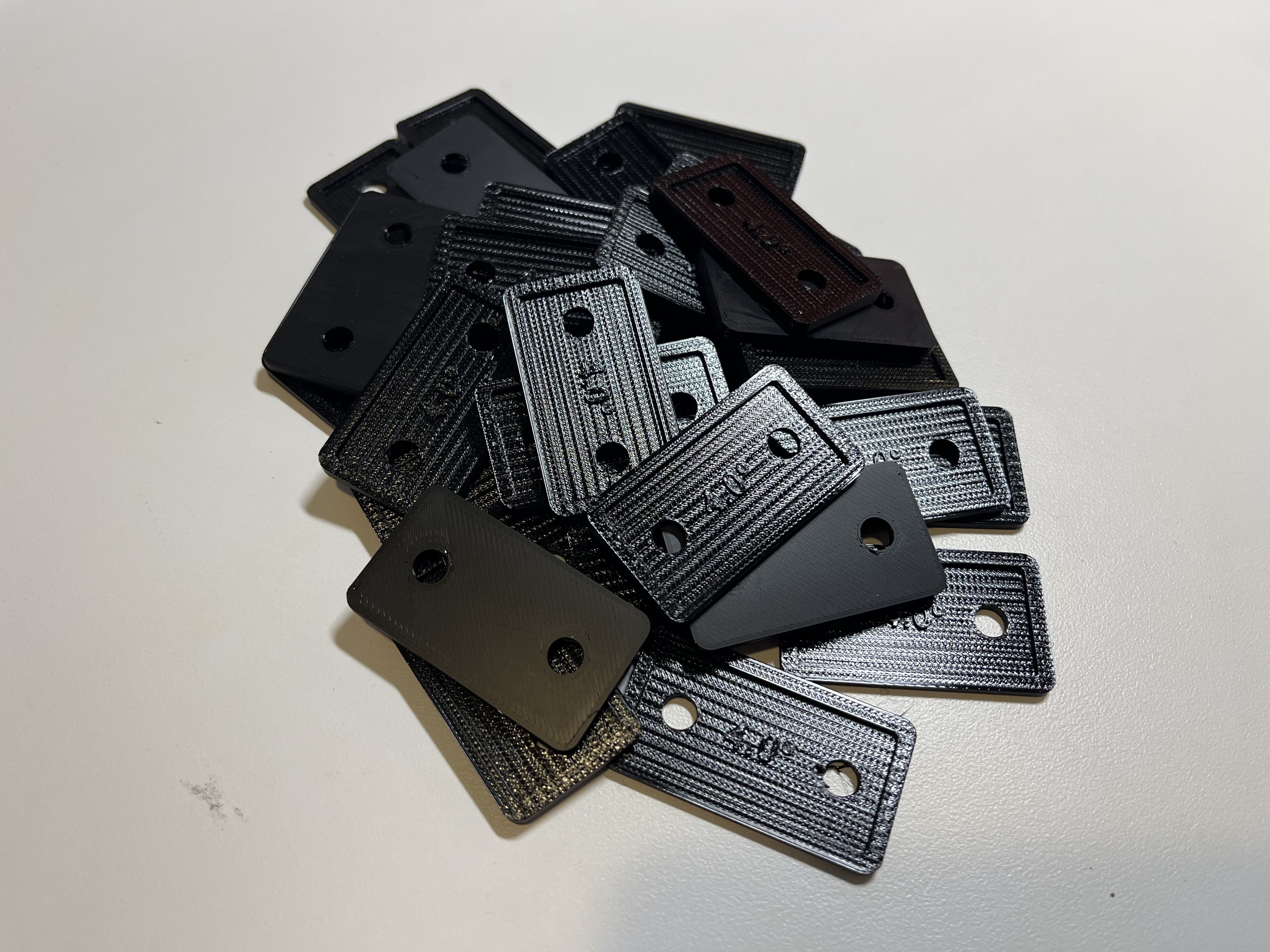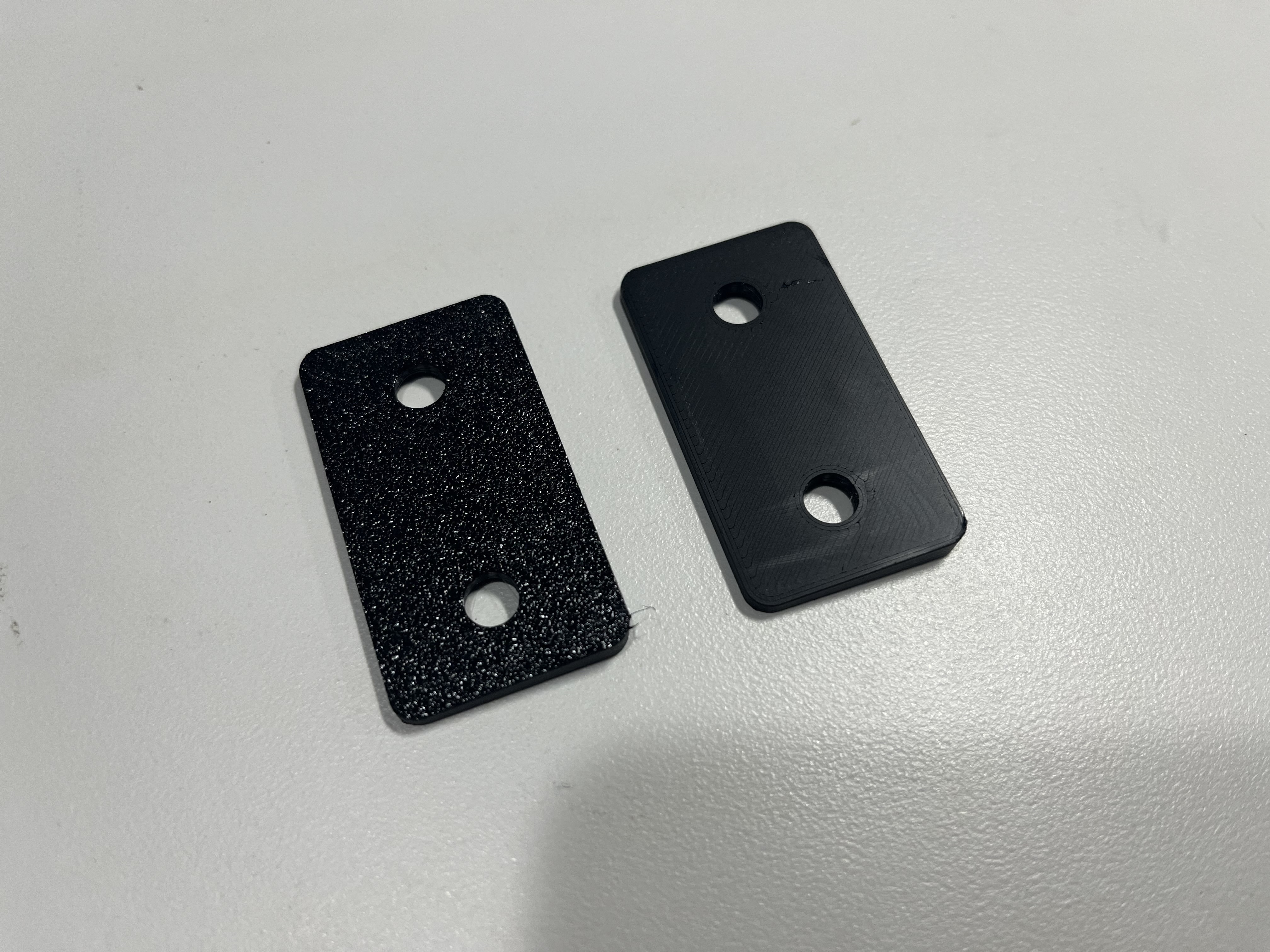 My son Harry went into production mode today. He decided to order a smooth printing plate. This makes the wedge base equally smooth where it contacts paint. The photo show the prototype on the left and the new result on the right. Note that the surface that contacts the mirror base still has printing texture.
