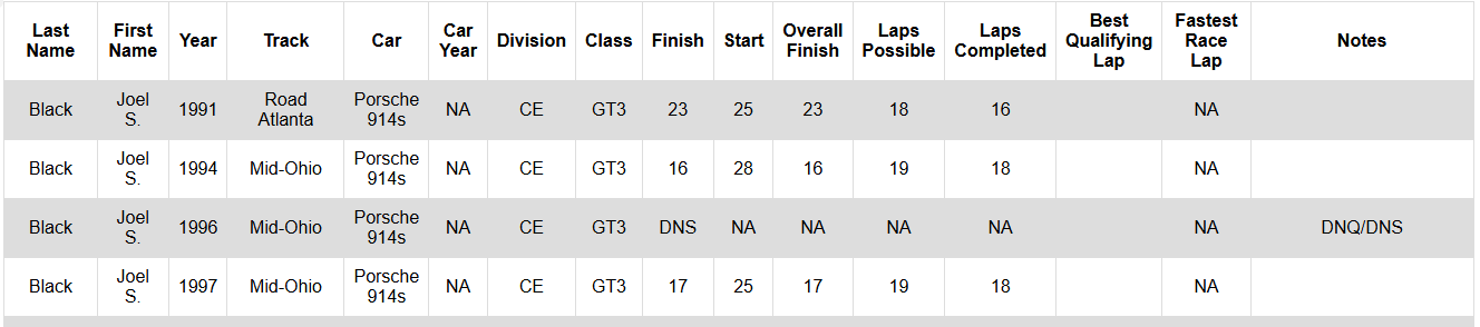 I sent a note to the Regional Exec for NEOhio to see if he can find info in that logbook number. I also looked through the SCCA Runoffs Archives and found the attached results; it competed at the SCCA Runoffs 1991, 1994, 1996-1997. I perused current membership records and do not see anyone with those names. Somewhere in a box in the basement I'll have event programs and results for the 1991 Runoffs (I raced it at Road Atlanta 1989-1992, then again 2010-2023) but that would be quite the chore to find it... More info if/when I come across it. - GA Huge Thanks Greg, This is helping to fill in some blanks on it's history. I'm pretty sure that this is the same family that John Black, several time national champ, are all from. Joel, the dad, has passed away. The races I'd be curious about are the ones that it appears John was the driver. They'd be: Mid-Ohio OVR Nat -Mid OH - 6/11/99 CAt National (?) Road America 8/1/99 Buckeye Sprints - Mid OH - 8/27-28/99 Again - huge thanks. Don't do digging on my account (my own basement scares me a little..), but should you come accross any memoribilia that might apply I'd be much obliged. Cheers! |