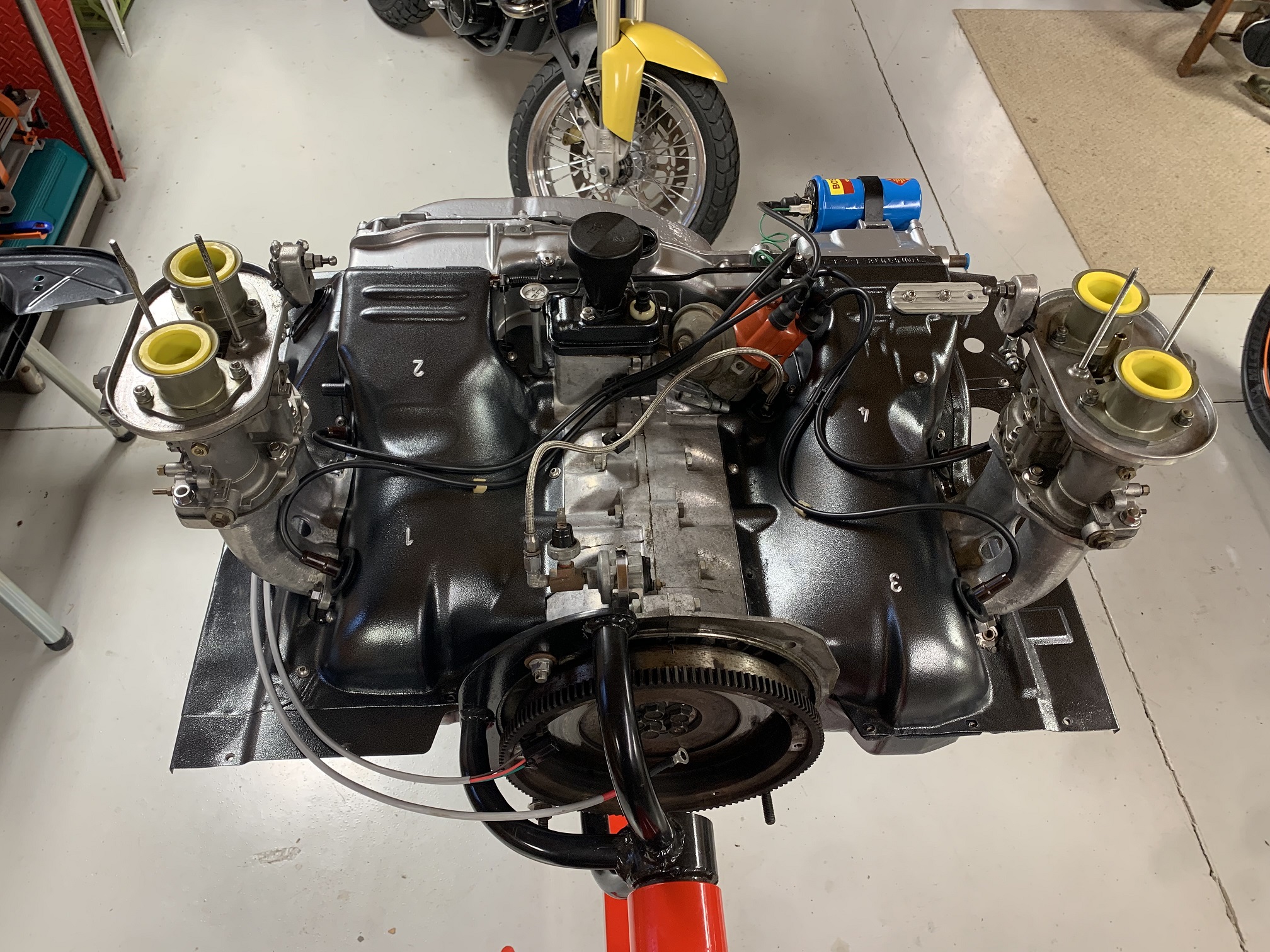 Engine went in on Friday. Easy peasy. After I poured a celebratory Bourbon, I realized I had installed the moustache bar incorrectly. Easy enough to fix. Attempted to start her up today. No go. Triple checked everything. No vacuum leaks. Fuel pump is working, carbs are getting gas, plenty of air, so it must be spark. Yep, dizzy driveshaft installed 180 degrees out.