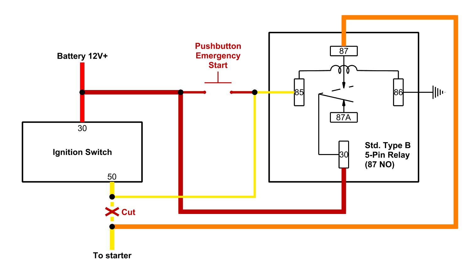 While I'm in there, after having read through the various threads here, I think I will also install a relay. One of the advantages is that I can also add a pushbutton switch hidden somewhere that will start the engine in an emergency if the start contact fails again. I drew the following out just to get the wiring straight in my mind... Look correct to you? Just need to figure out the best place to cut/splice the yellow wire going to the starter and where to tap into the fat red 12V+ wire. Also how/where I'm going to mount the components. |