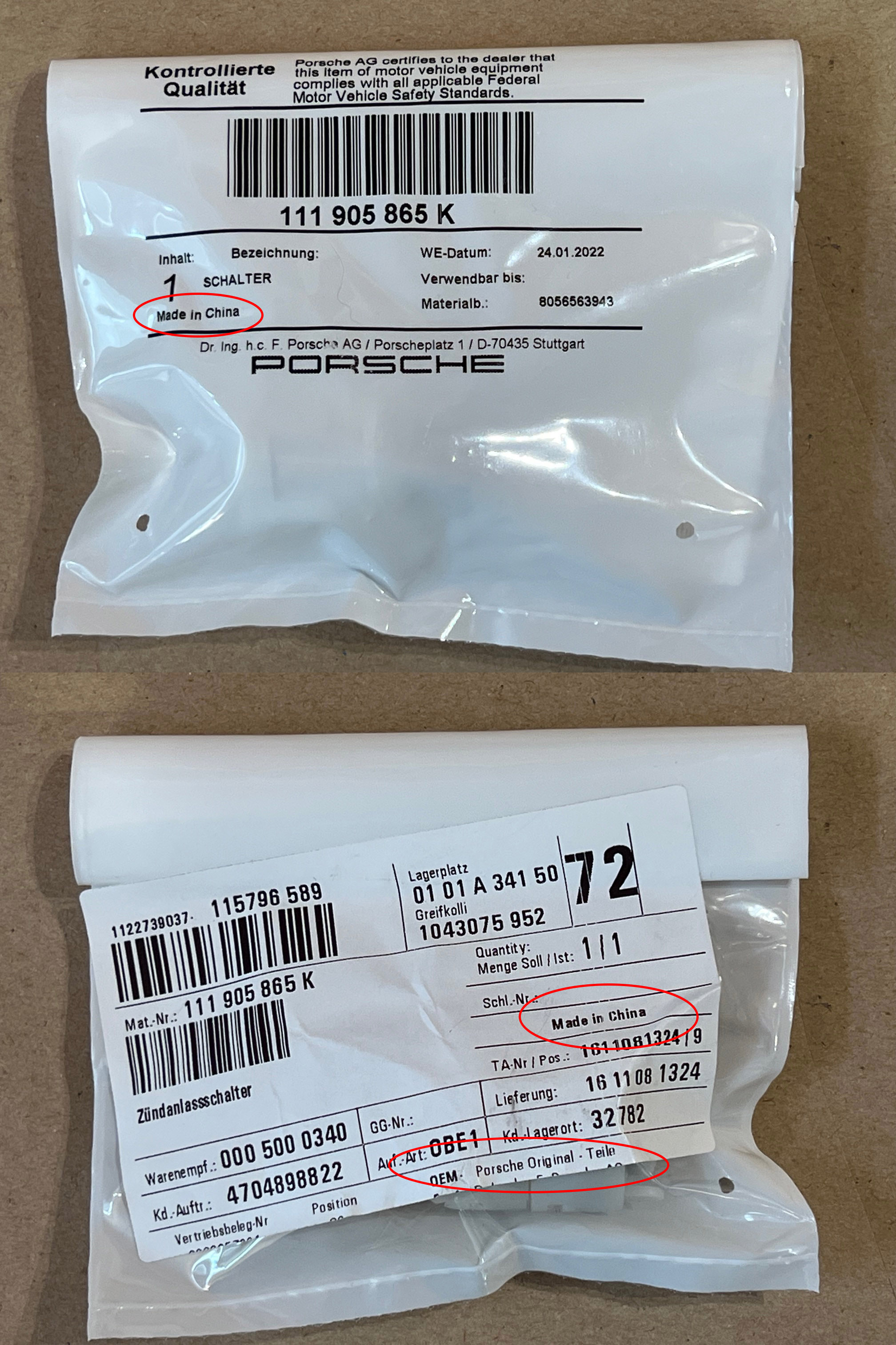 So got the Partworks switch in a couple of days ago, but didn't have time to post. The label says "Made by Partworks", but does not specify where... ![]() Comparing the two parts, while the overall shape and concept is the same, there are a few details that differ. The Partworks surfaces are shinier - the Porsche-supplied part has a texture on them. And a closeup of the connector end shows that the pin numbers are different sizes and placements: (Partworks part on the left, Porsche supplied part on the right) @chmillman So, the outer pastic parts at least were made in different molds. Which could mean two different manufacturers, maybe. That doesn't say anything about the quality of the plastic used in either, and there's no way of knowing what the contact parts look like inside... Interesting, kind of a tossup. I guess I'll put in the Porsche-supplied part to start with. [shrug] so one difference that I see is that the top picture the back pin on the bottom, sticks out further on the Partworks one than the Chinese made Porsche part, I would be inclined to use the Partworks one first. Not sure iif that length of that black contact pin will matter or not, ..... Phil |