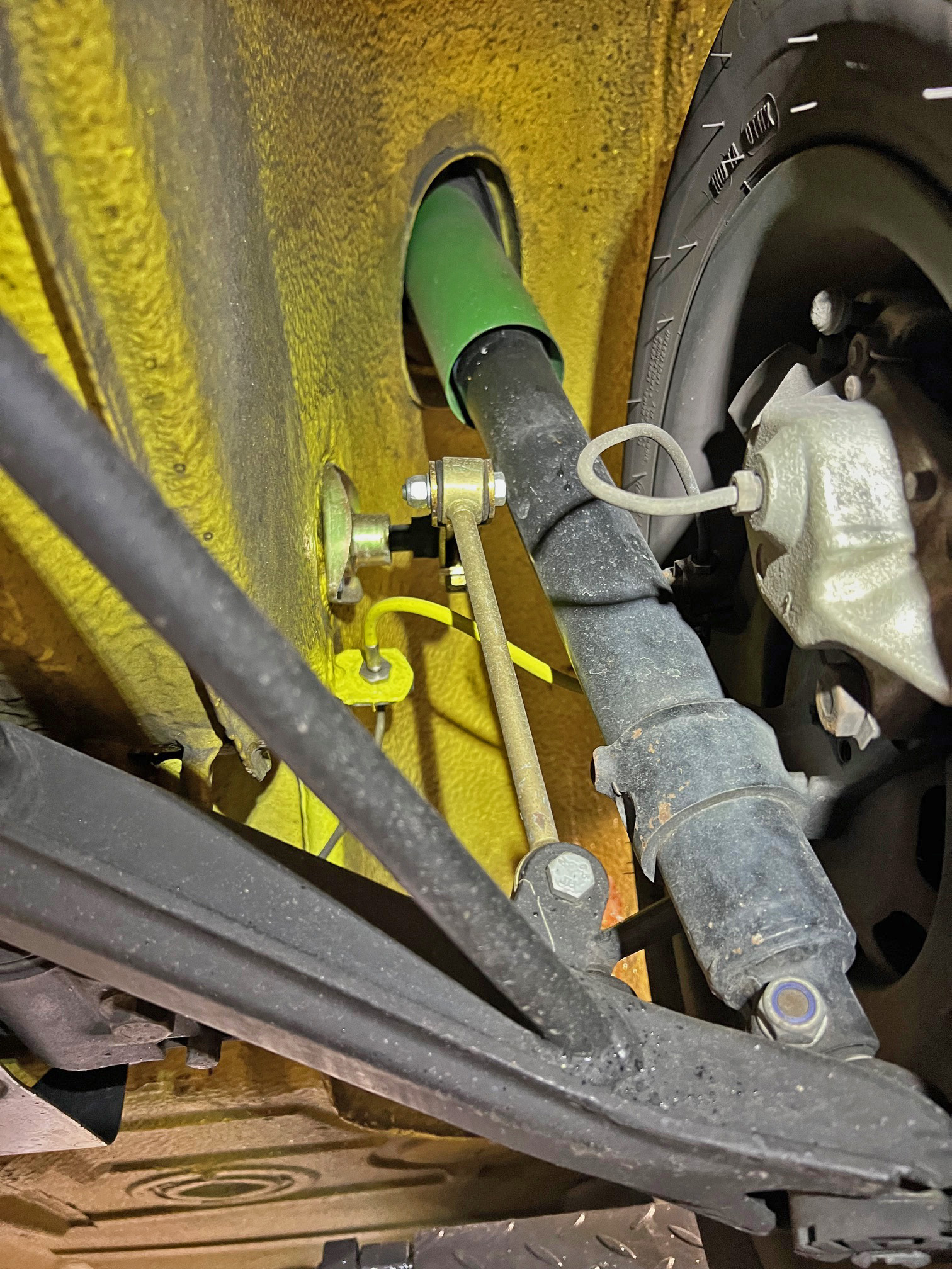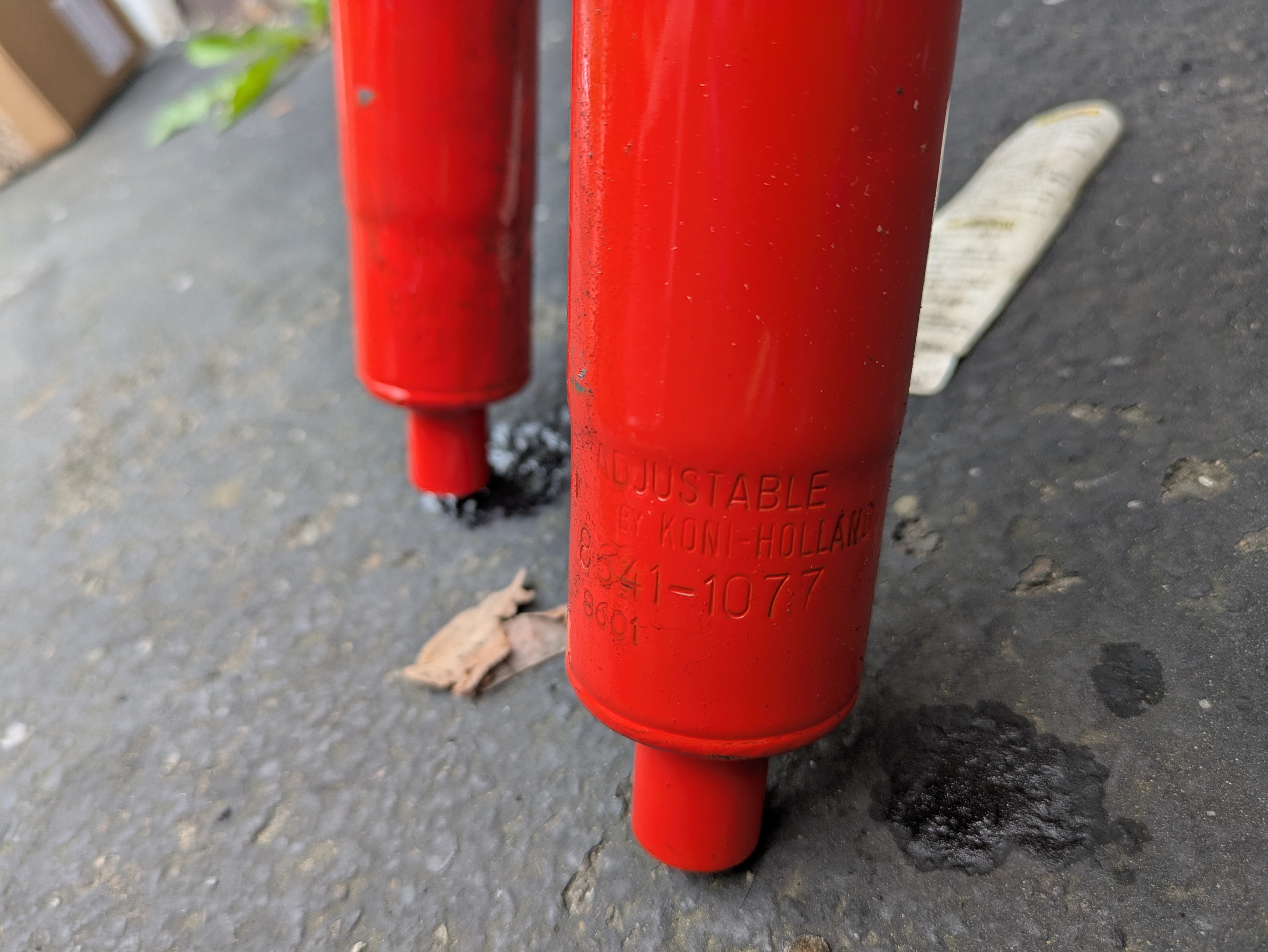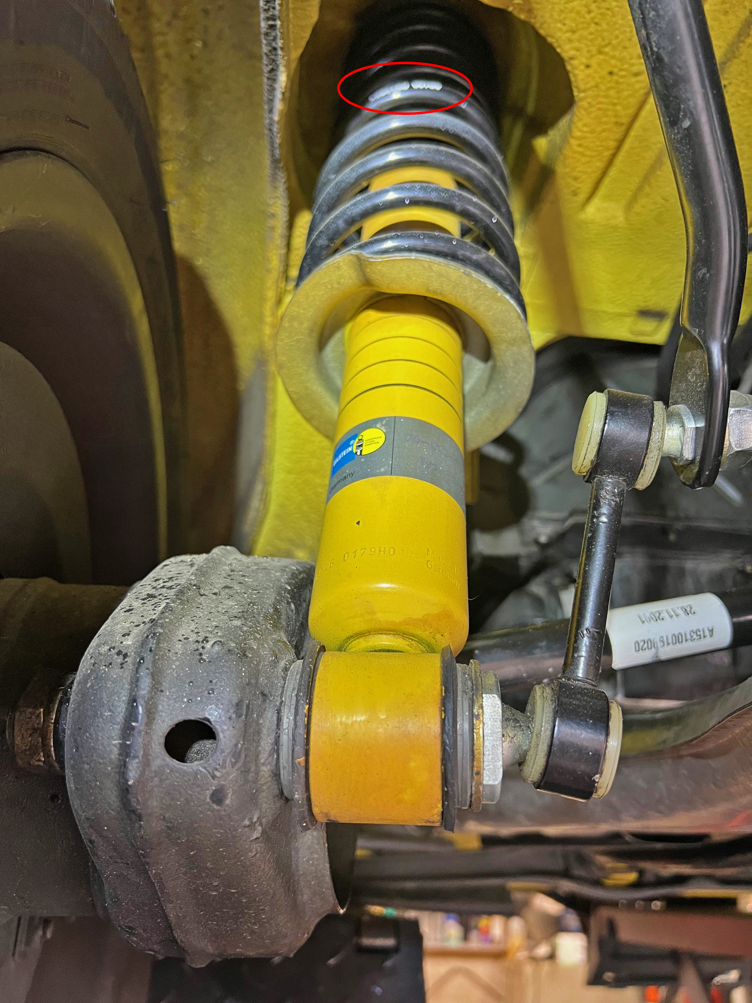 If the struts have been switched out, you need to figure out if they are Boge, Bilstein or Koni and if the caliper spacing is 3” or 3 1/2. Early 3” Boge 911 struts will take the same Boge inserts as a 914 but everything else is different. The most practical way to tell if the torsion bars are bigger is to measure them. If they are 911/914-6 size, they are 1mm larger. That makes them stiffer but doesn’t automatically make them “harsh”. So the first step is to figure out what you have so you can decide on the best solution. So, the bolt center to center spacing on the calipers looks to be around 76mm or 3", so older non-S 911 parts I assume. Viewed from the front they look like this: The green dust cap up top looks newer than the strut itself... And I did actually find a marking on the rear springs... Did a search for the number but didn't find anything right away, but I assume SP100 indicates 100# springs? (more or less stock... hopefully not 100Kg...) 912 parts? Edit: AI is telling me they are probably aftermarket from Weltmeister. The sway bars are 15 front / 16 rear (stock option size) |