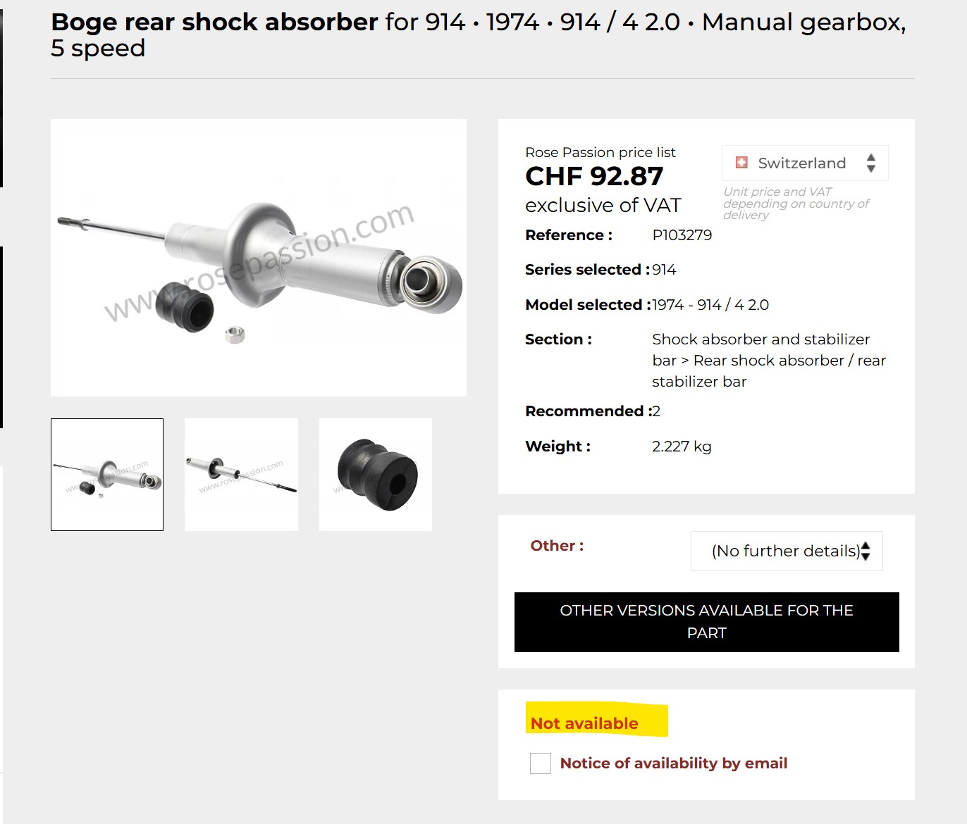 Late last year, had to replace a broken front Koni (that came with the car), my guy here suggested replacing both sides with Bilsteins and I said OK... There were already Bilsteins in the rear when I got the car. Me and everyone else who has ever ridden in this car agrees it's now way too stiff. I was looking around for alternatives and found this: https://www.rosepassion.com/en/diagrams-por...1-103278-z90088 Real Boge's?? Didn't know they were made anymore. Look reasonably inexpensive too... Unfortunately, the rears are listed as out of stock... https://www.rosepassion.com/en/diagrams-por...absorber-103279 I know AA has remanufactured both front and rear (further up in this thread). Shipping of a couple of rears to this side of the pond would be pretty expensive, and there is always the question if they even accept things with pressurized gas... @dr914@autoatlanta.com : you said above that they were manufactured in England... Any way to get them directly here in the "old world"? EDIT: just found there are also front and rear KYB units available here… worth a try? Also, I have no idea which springs/torsion bars are actually on the car. How to tell? TIA |