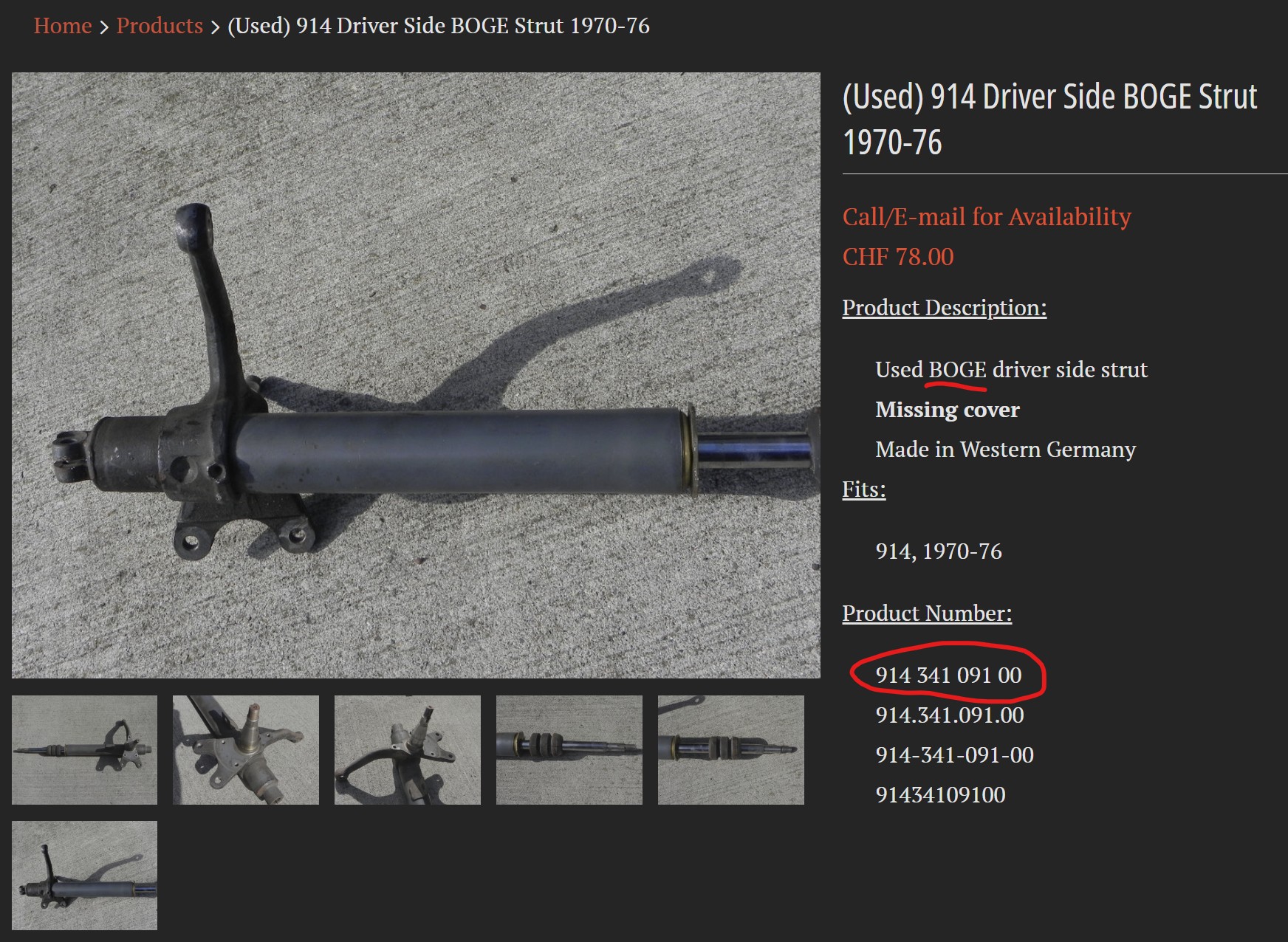your struts have correct numbers for a 74 Well, not according to the image above... I have the same parts catalog. 72 and up left side is listed as 914 341 081 05 (082 right side) Mine are 914 341 091 00 (092 right side) Interesting, I found a used part for sale at AASE which has my part number and says it's a Boge strut... What's most important here is what kind/brand of shock insert will fit in them to replace the BBB's (Bone-Breaking-Bilsteins) ? Edit: More searching under that part number gives me all sorts of references for the inserts - not the strut itself. So, is it possible that the number on the outside indicates the insert to be used? Edit #2: Ahh, and this found on PMB's website: QUOTE 914-6 Struts are simply 911T struts in all measures. The odd thing is they come with a 914 part number. That said, don't be confused; the 914-4 strut is quite different. One clue is a straight steering arm on the 914-4 version. Another is the smaller spindle. Yet another is the 16mm "coarse" thread (16x1.5) rotors attachment nut vs. a 16mm "fine" thread (16x1) attachment nut for the 914-6 and 911 versions. If the odd chance (they're not that common) you have 914-6 struts, you're good to go. Part number for the -6 struts is 914 341 091 00 and 914 341 092 00. Again, they are otherwise identical to the 911 version. Again, a "guess" would have it that these had to have 914 part numbers to be assembled as a complete unit into a 914-6. That "unit" (which would consist of the strut, inserts, hubs, rotors, backing plates, balljoints, a-arms, etc...) would basically have no other part numbers on it. Having the 914.341.xxx.xx number would signify that that "unit" had the proper 914-6 17mm torsion bars with the 911 spline count. Wow... they're really -6 struts? |