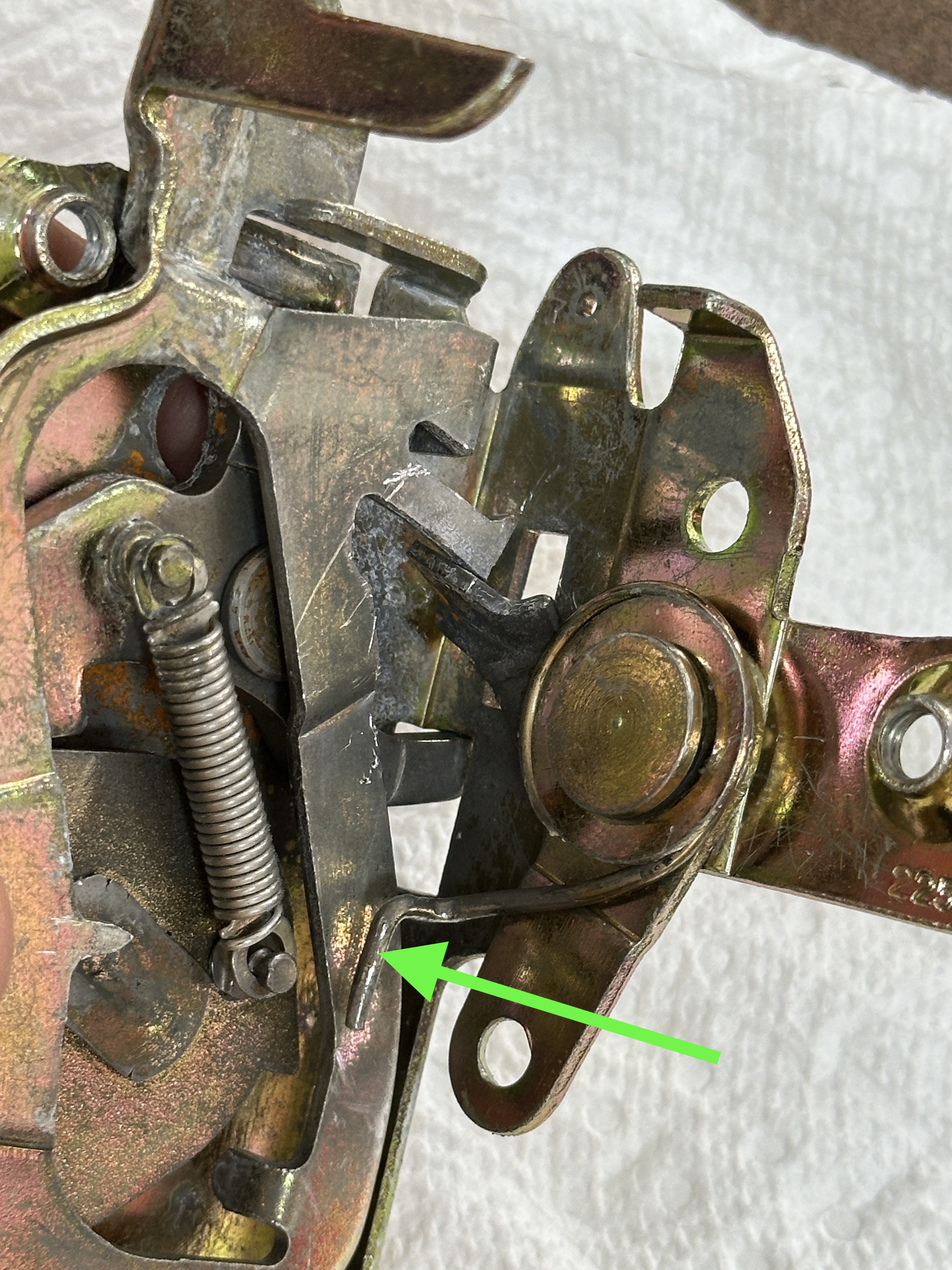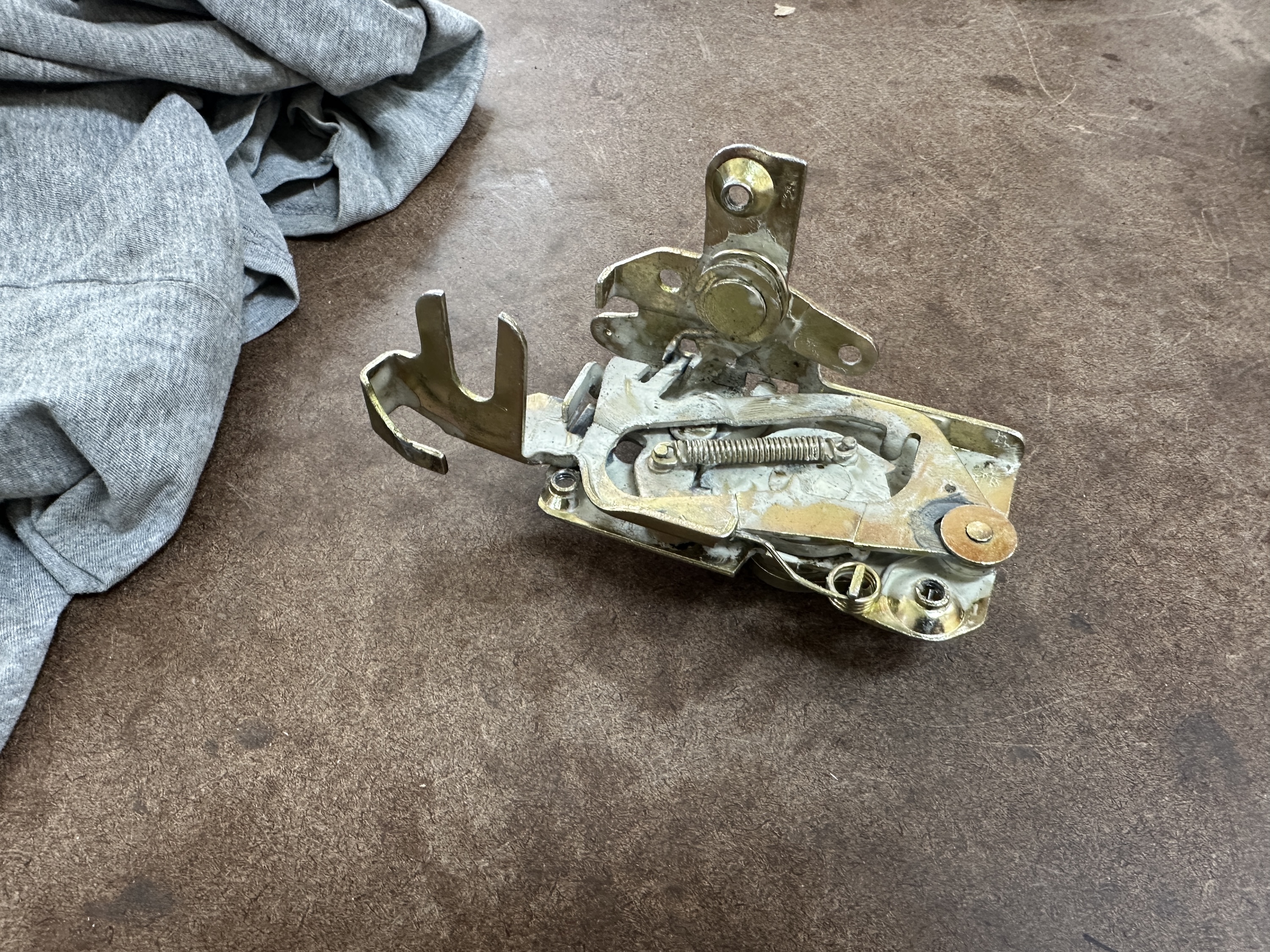Mine is too stiff, I think. Oh, the thing I mean is the internal door latch mechanism. And the part that seems stiff is the locking function. In case your never spent any intimate time with the mechanism, the locking function is done by a stamped plate that shifts up (to lock) and down (to unlock). I continue to have problems unlocking the doors with keys, even after Curt did his magic on the cylinders. Since the up-down shift of the locking plate is accomplished by the little lever on the internal end of the cylinder, as twisted by the key, so it would seem to be better if the plate shifted without much resistance. Oh, and I have tried some different lubes. I remember (IMG:style_emoticons/default/sheeplove.gif) with that Bob. Let me get a look at one in my stash so I can better describe the issue I had. I remember it was a spot that served to anchor a part while providing a rotational pivot point. Metal to metal. No amount of cleaning, soaking or oiling helped much or for any amount of time. (IMG:style_emoticons/default/beerchug.gif) |