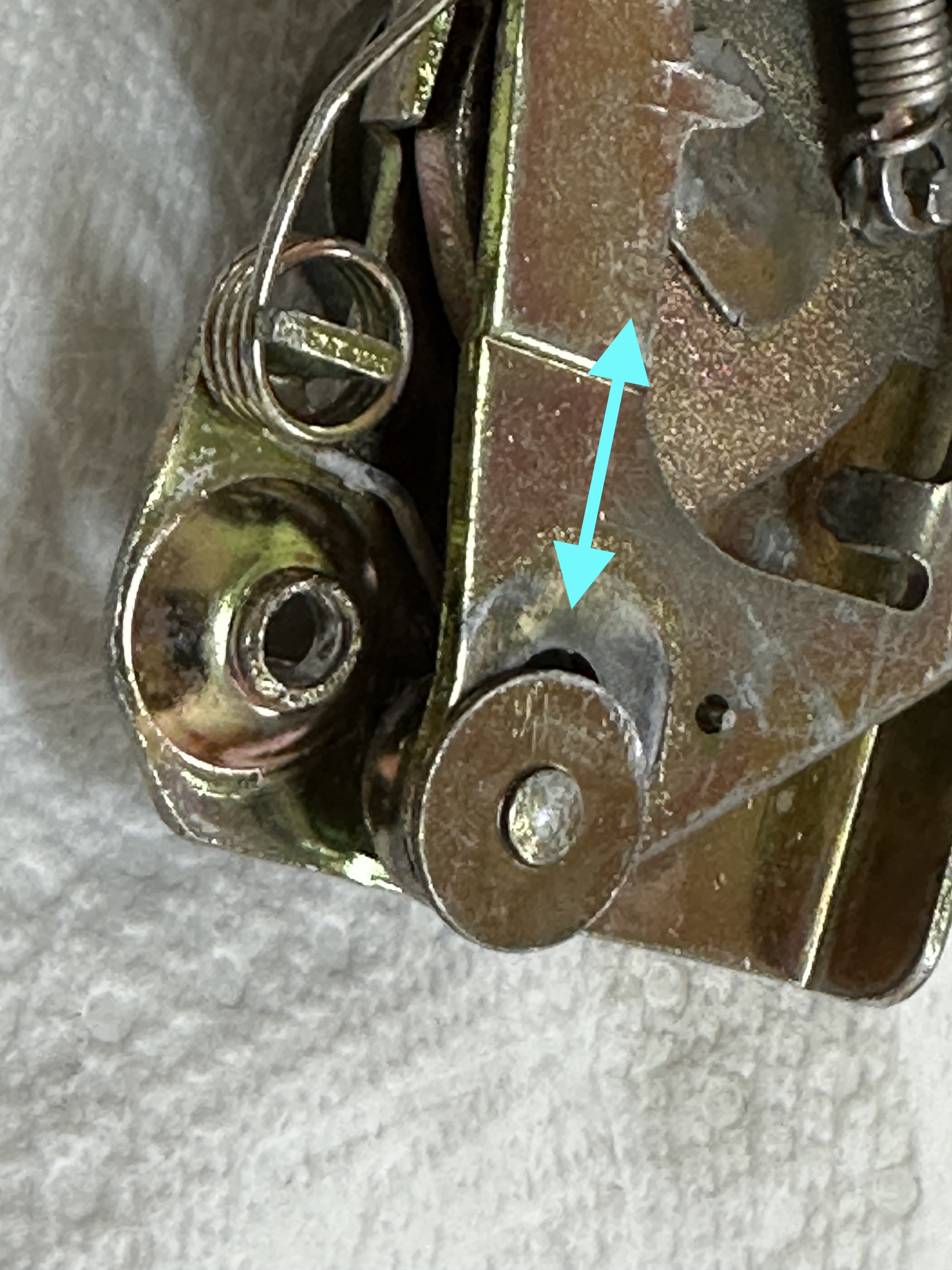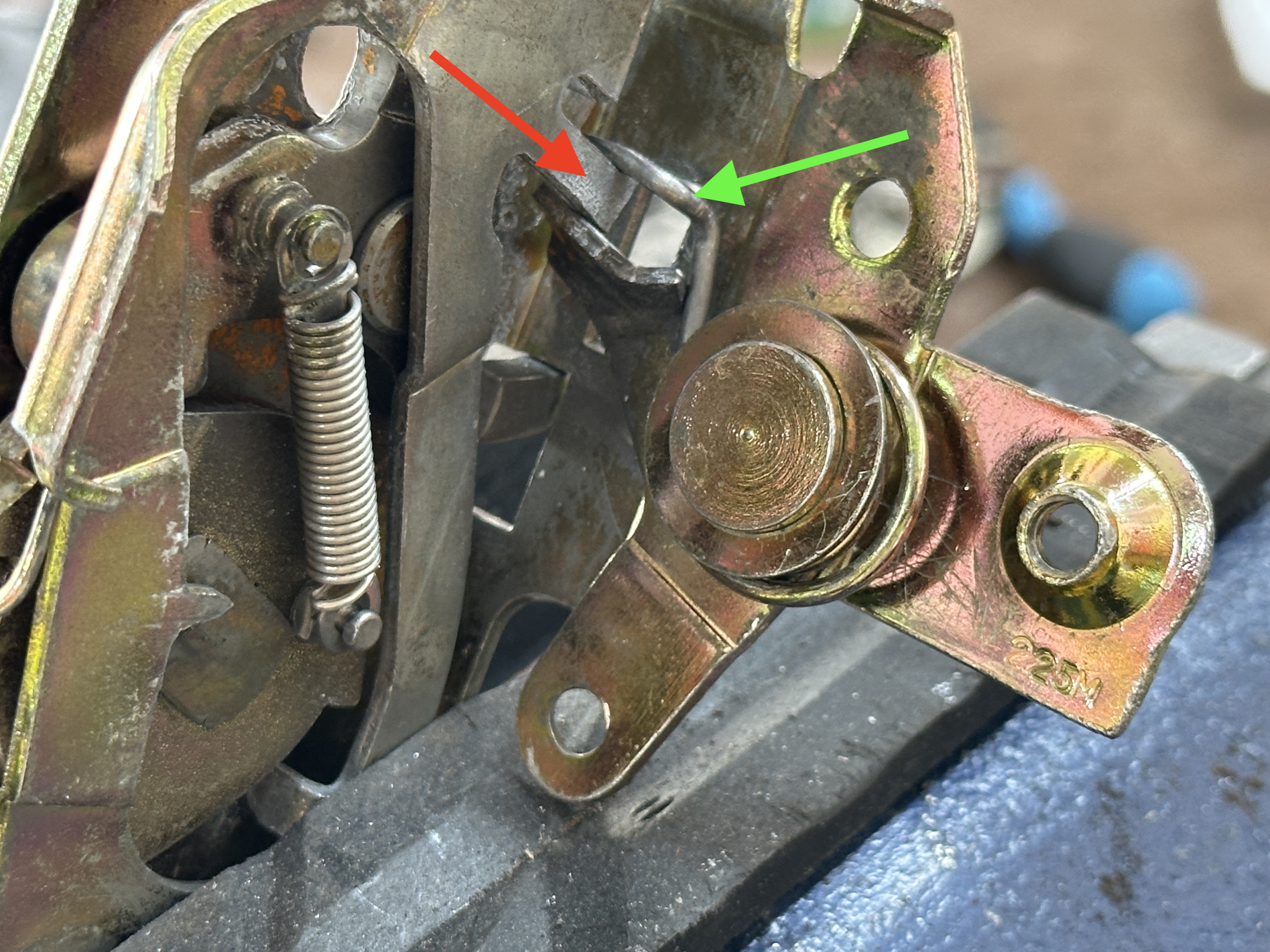 Now the locking plate and tab (red arrow) can shift without moving the pivot. This cut the resistance in shifting the plate by more than half, and that's without the rod and linkage to the internal lock button.