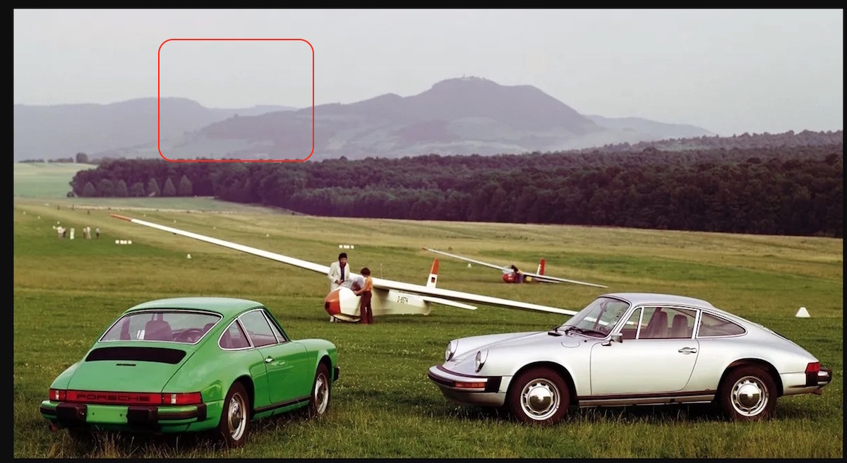 I agree that the Backnang-Heiningen Airfield would make a lot of sense due to its proximity to the Porsche premises, but upon careful scrutiny of the area on G-Maps street views, the hills in the original photo I posted look quite a bit more substantial in height than those in the Backnang-Heiningen locale. Then again it could be an effect of the camera lenses used. Osnabruck914 getting closer on your location for the photoshoot @Osnabruck914 porsche used the same location 1 year later (late 73) to take publicity shots for the new 74 MY G series 911. its a more panoramic shot showing the distant and close landscape. they appear to be further up the hill and the airfield is fully visible. the earlier 914 shots appear to have been taken down at the bottom somewhere and using a more compressive telephoto lens. you can see the distinctive profile of the hills in the background that i have outlined in red. they could be at a place called the Wasserkuppe. its a very famous historic spot where german gliding occurred between WW1 and WW2. but i am not sure. would have to study more photos. with added difficulty a lot can change in a landscape in half a century. (IMG:style_emoticons/default/beerchug.gif) |