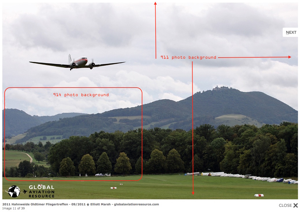 I must say, both your theories and pics are convincing. Now I'm really kornfused. Osnabruck914 The picture with the 911s is further from the mountains and has an extra wooden area in between the air field and the mountains. The Hahnweide Flugplatz matches that location exactly. The picture with the 914 is closer to the mountains without any additional wooden area behind the air field. The Nabern Flugplatz matches that location exactly. And both are very close to each other, just about 2 miles apart. (IMG:style_emoticons/default/piratenanner.gif) One more, in the picture with the 911s you can clearly see "Burg Teck" (Castle Teck) on top of the right mountain which also points to the Hahnweide Flugplatz for that picture. The 914 picture shows the mountains from a slightly different angle since it was taken 2 miles apart and closer and the castle is just out of view to the right on top of the hill. (IMG:style_emoticons/default/smile.gif) |