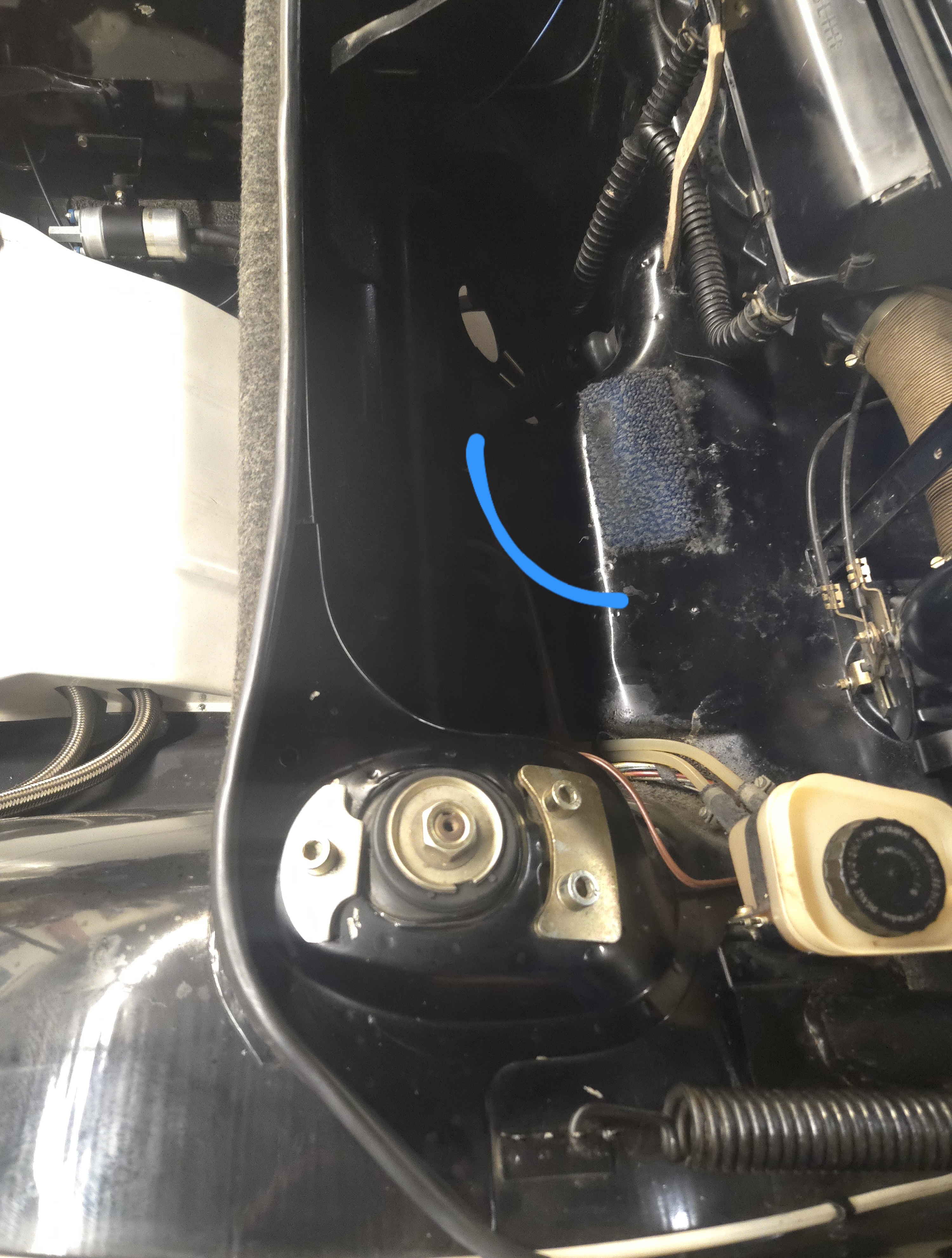 While my '74 was over at my mechanics shop for a fuel tank change-out, he showed me this bit of carpet in the fuel tank compartment. He has seen the blue/ black factory carpeting (used here as a tank buffer) utilized on the factory RS, RSR + IROC cars minimal interiors.