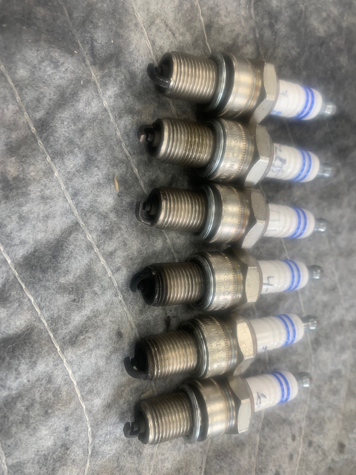 Hi, I came back to this car after a few major trips and family events………. I took all of the plugs out and retested the compression – the engine is super cold (15 degrees out) garage is heated to 40 at all times. Compression is about the same as listed above – 5lbs less for all cylinders. I am declaring that compression is not the problem Next, here are the plugs – the 1,2,3 plugs look good – the 4,5,6 are very heavy, rich I am going to start over – my sense is that it should be possible to get this car to: Prime sensibly – fuel pressure and then couple of pumps Start with a couple of cranks Sustain the running while in high manual idle until warming up And then, can idle smooth and clean at 900 Here are some pics of the plugs – what would you do next? Ignition? Plugs 1->6, L->R Respectfully, Cary Conrad Are those plugs any good they look old to me ? see they are Bosch ,looks like the worst 3 are fouling, have you checked for a good spark @ each cylinder ? ,is your CDI wiring good ? points set up right ? Did you set the float heights correctly and what gauge did use ?,check to see if you have no spill over into the throat's under some throttle that will cause the very rich condition you have . Don't for a minute think that previous work on the carbs has been done right ,pay to add the following ; Vent size, idle jets, main jets, air correctors, emulsion tubes . This would help a lot ,good luck and report back. |