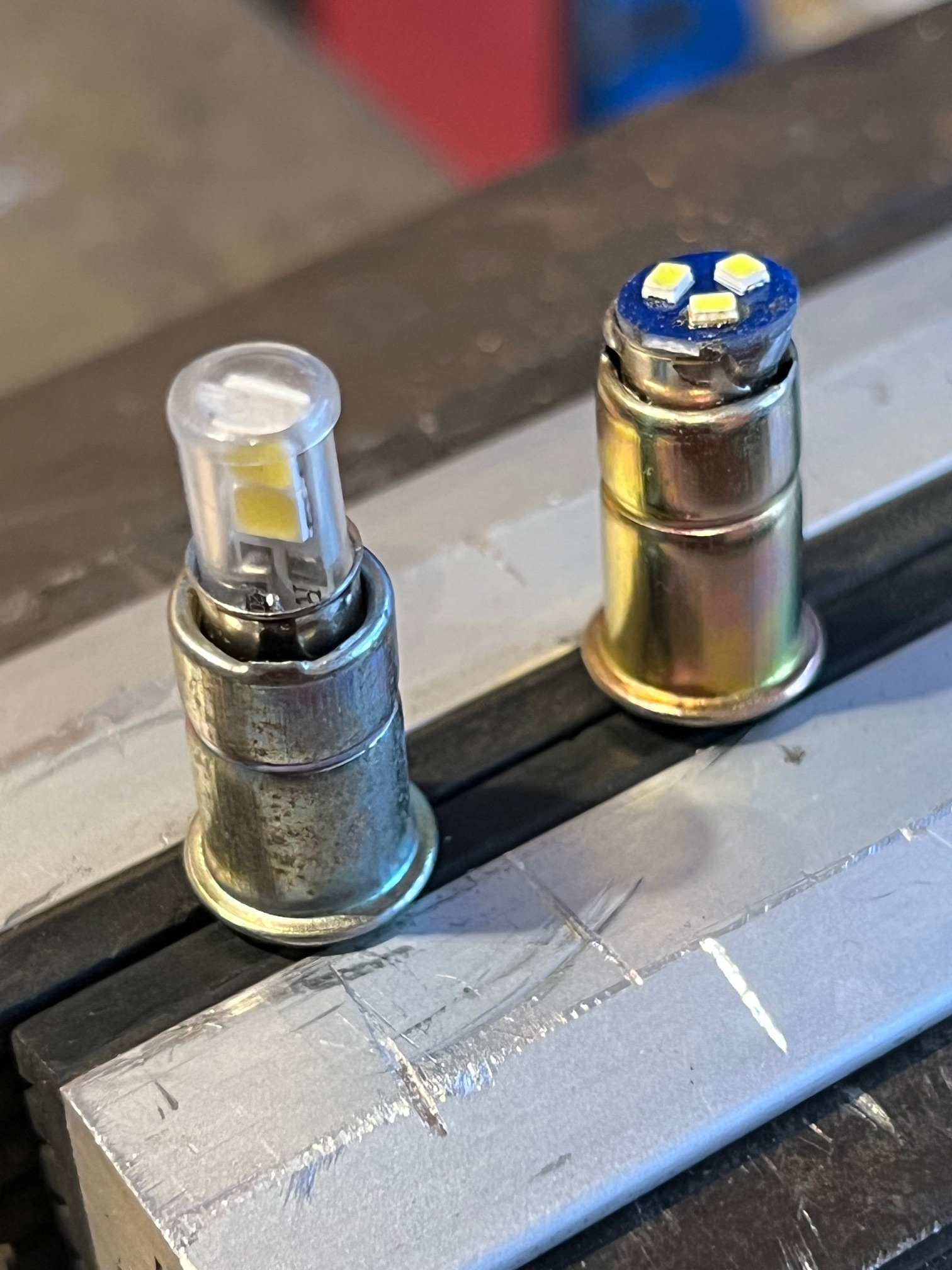 Previously I was able to pull the gauge panel partially out with the steering wheel still on, in doing so I was able to replace the existing dash lighting tungsten bulbs with LED's - but I could never get the bulb for the brights indicator out - it was stuck in place and impossible to remove in that position. So finally with the steering wheel off, I disconnected the various wires and pulled the whole tach gauge out. Then, on the bench, I was finally able to gradually work the brights indicator lamp holder out of the socket in the gauge. Mine is a '74, but it actually has a '73 or earlier tach, with the individual left/right turn signal arrows at the top (which I much prefer over the later version) and the brights indicator at the bottom. I pulled the existing bulb out and tested it... and it worked. I was like huh? Why am I not seeing it light up in the gauge? So then I held the gauge up to the light and looked into the socket hole to see if I could see anything. Nothing. Then I tried holding the soocket side against a really strong light and looked from the front - and then I dimly saw some blue light... So I surmise that over 50 years, the blue plastic has simply aged and gotten darker, to the point where it's almost opaque. Nothing I can do about that short of having the gauge rebuilt - which it doesn't need, the tach works perfectly, as do the turn signal indicators. I put in the brightest front-facing BA7 LED's I have been able to find - the right one in the image below. I have one of these already in the green parking lights indicator on the speedo and it's almost too bright. Now I can kinda sorta see a faint blue glow if I'm driving the car in the dead of night with the high beams on. During the day though, it's still invisible. So if you think yours is not working, it might be the same as mine. |