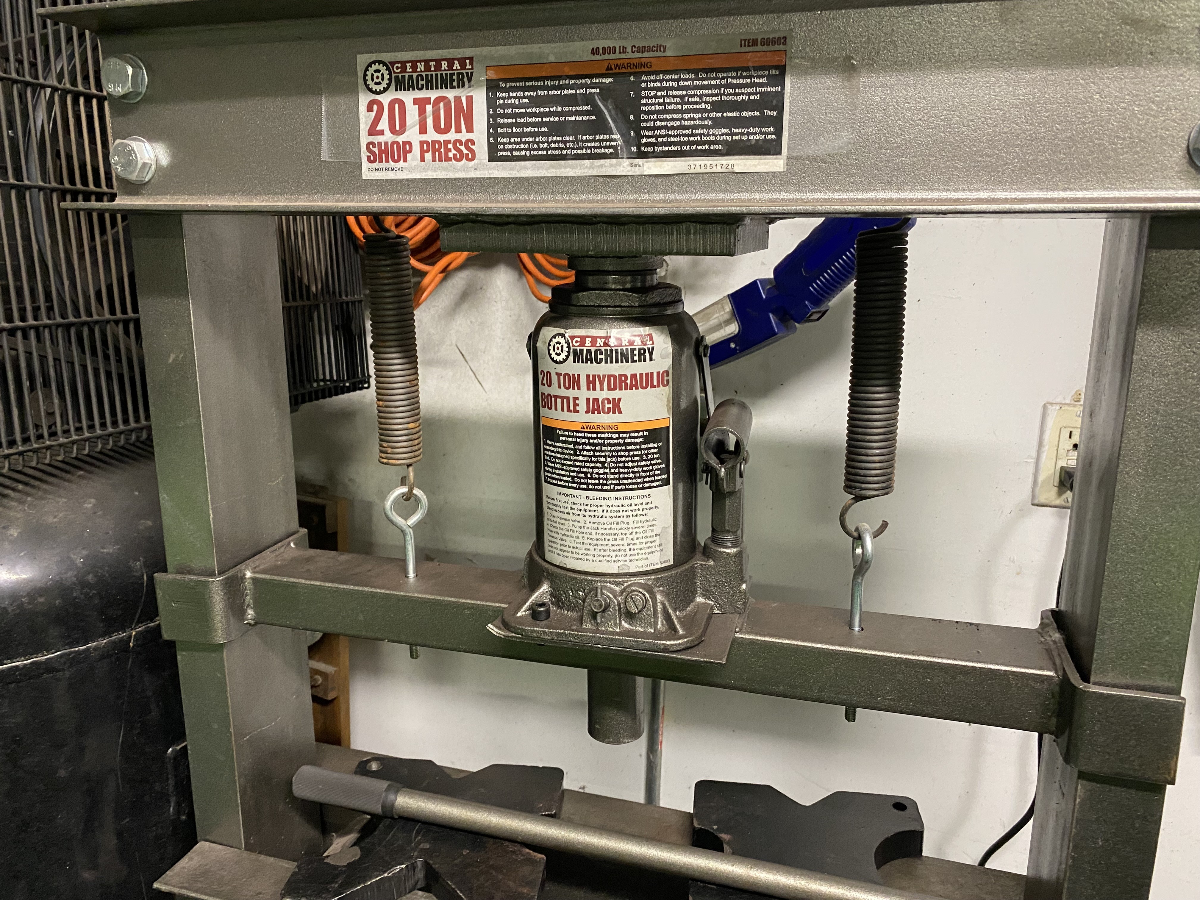 I bought a 20-ton Harbor Freight press for $100 at an estate auction. I have found it to be an invaluable tool. I have used it for removing and installing wheel bearings, suspension bushings, crankshaft gears, and even stubborn rusted bolts in exhaust parts. Much safer and more controlled than the hammer. I have had some kind of press for 25 years, and now could not live without one. For lots of jobs a press might be optional--but way easier. For other jobs, the press is the RIGHT way, and make-shift methods are asking for trouble. And with other accessories it can do more. I recently bought a press brake and can make sweet bends in medium weight sheet metal. |