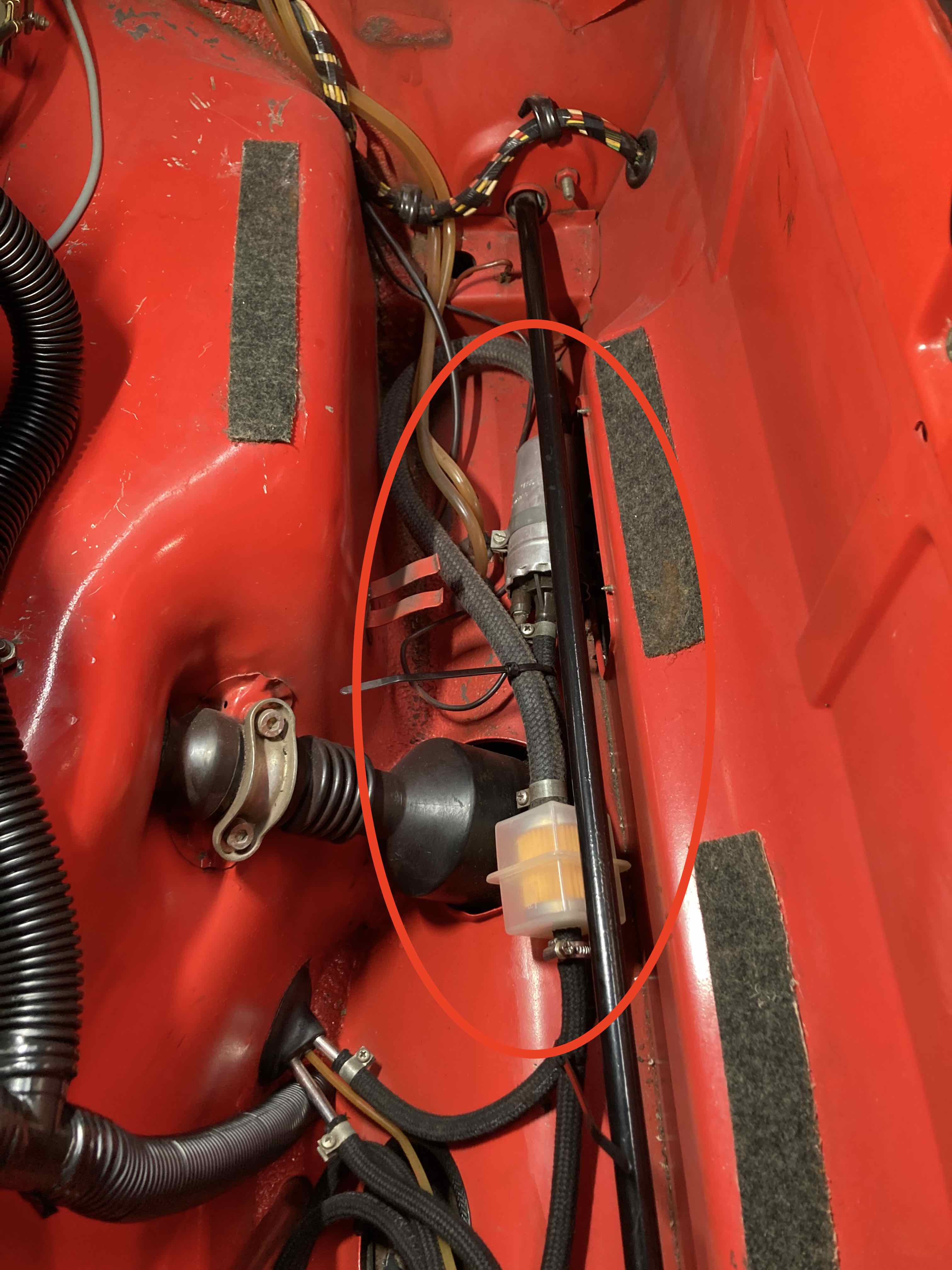 Hi, purchased a fuel pump from 914 Rubber. Their part number is 043 906 043 The pumpkin is a 70 4cyc. Web site says I need an early to late fuel pump conversion. Can't find anything on website for that. Anybody have a Idea what I need . I have sent 914 Rubber a msg via their contact us email and waiting to hear back but really don't want to wait in case some one knows about this. Thanks Renee Just heard from 914 Rubber, they don't sell conversion kit (or what ever you call it) Mallory said he would research it and get back to me. Great just Great. (yes that is sarcasm) DAMN IT ALL ANYWAY If your pump is located in the front right corner of the engine compartment I believe they want you to move it to the front trunk firewall area . This is where the pump is located in my car a 76 . here's a photo Thanks for reply, car is a 70 and pump was in engine compartment. I moved it up to the same area yours is. Lost both Master Cylinder and Fuel pump on a nice twisty ride here in So. Oregon. So MC is in and brakes bled. New fuel pump is next. Seems as if new pump the inlet is larger than the outlet port. If by conversion they mean adapter for line from smaller (out port) to larger OD)line that goes to fuel rail etc. then I have that adapter and no problem. I guess I'm just a ton grouchy tonight. I would think a website would say only late cars fit this pump instead of putting that conversion statement online when you don't sell it and it is not clear at all what needs to be converted. Sorry Rant over!  |