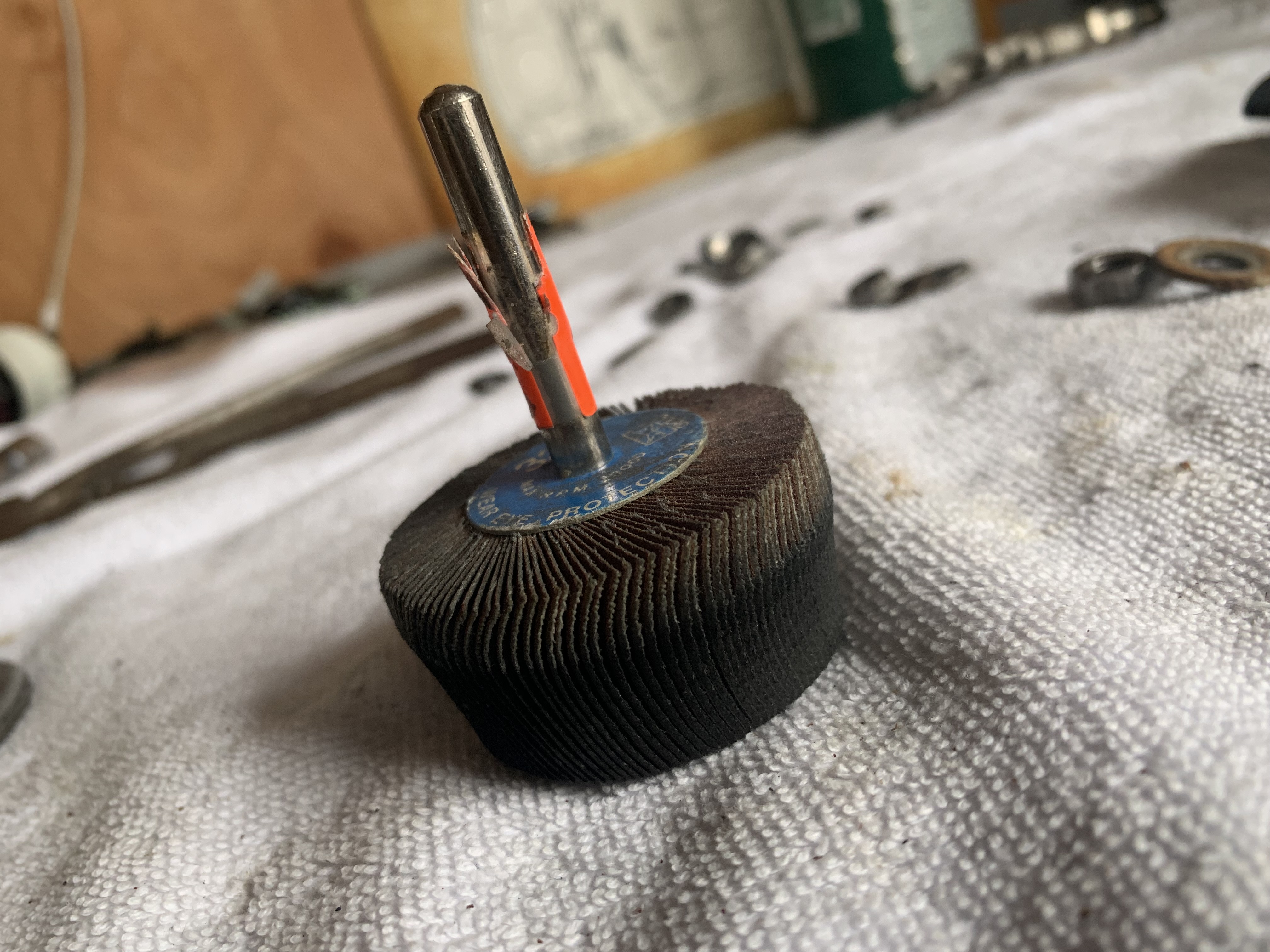 Using flap sander on the drill press... sadly this is my last one and I'll have to use another brand