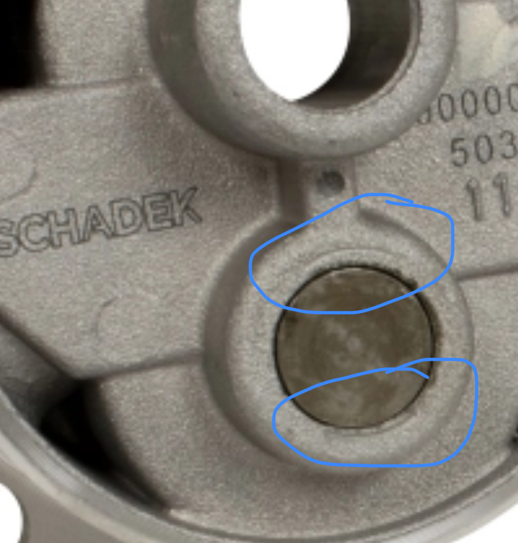 Keep in mind, I’ve seen some of the T1 pumps that are modified for T4 use and this factory peen get machined off. Effectively leaving you with an unpeened idler . . . Just like the OEM T4 pump that everyone dogs for the potential migration issue. Go figure (IMG:style_emoticons/default/headbang.gif) see amount machined off (arrow) and lack of peen of what’s left (circled). I’m not suggesting all are this way, just the one I had in my hand based on what I personally saw. So I’ve seen different peened T4 parts and sometimes it’s a combination of multiple small peened spots and other times it’s just two or three bigger peens like the Shadek. I don’t think it matters all that much as long as the ID of that idler shaft bore is deformed enough to prevent the shaft from ever coming out proud of the pump body. Example of peened with multiple little deformations around circumference of the idler shaft hole. ![]() |