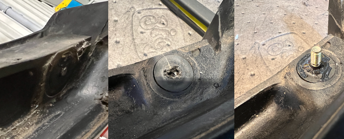 It's been several years, but IIRC, I was able to weld a washer to a suitable bolt and weld it to the internal steel of the bumper top IF the internal steel of the bumper top is solid enough to be welded to. (IMG:style_emoticons/default/agree.gif) Along the same line carefully use a small diameter hole saw to remove rubber around the remaining part of the stud. Mig a new 6mm stud to hopefully clean metal. Add support with JB weld. |
