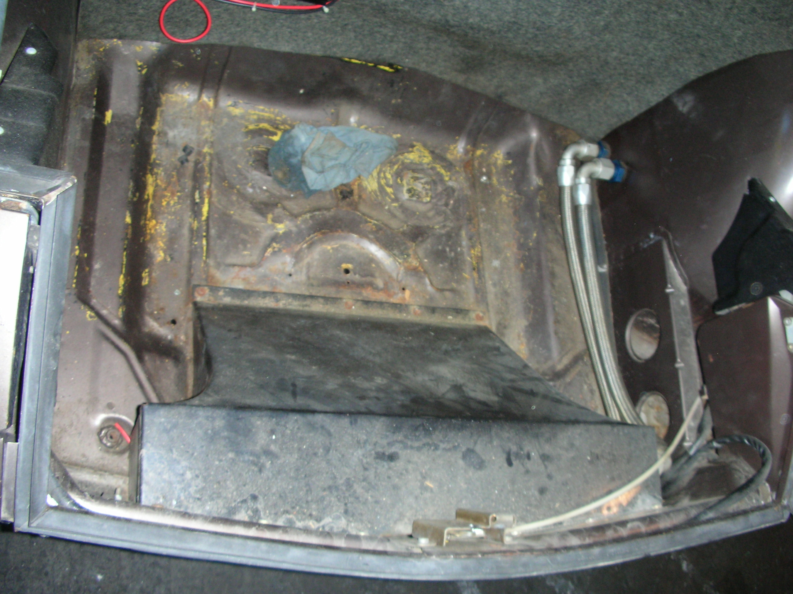 The braded lines run from the back drivers side along the drivers side, come up under the left wheel well, fastened to body and then with 90 degree AN fittings go into the frunk to Oil cooler and come back to tank in reverse way. See the red circles. If you do not want to use Bens GT lines, this is the way Trotman did it back in the day. If my set up was not in my car when I got it , I would of gone with hard lines. The two holes circled together are for the 90s. the small holes are for the bracket. Back in 07 Ben was not making the hard lines and they cost a fortune. I may have some pictures of the lines as they where but you should get a good idea how this kind of set up works. You can get all that info from PMB as far as the size. There is more that one way to do this. Best Bob B |