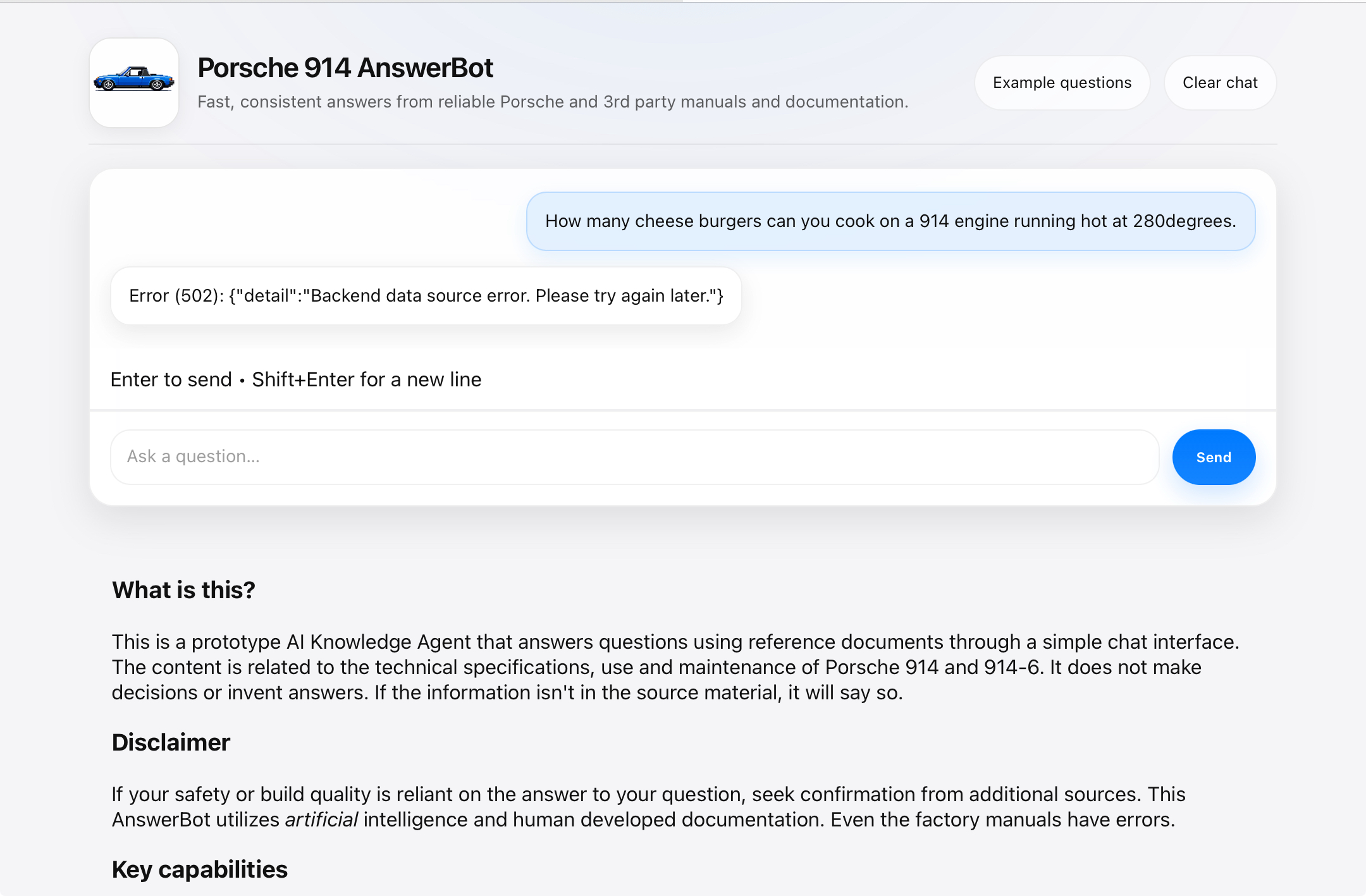Error (502): {"detail":"Backend data source error. Please try again later."} 502 errors happen when servers can't talk to each other properly. Simple fixes like reloading the page or clearing your browser data often work. For bigger problems, you should check server logs. Given the propensity to return incorrect answers and lukewarm reception, I didn't keep the backend service active. It is not a free experiment for me! It is back online now. |