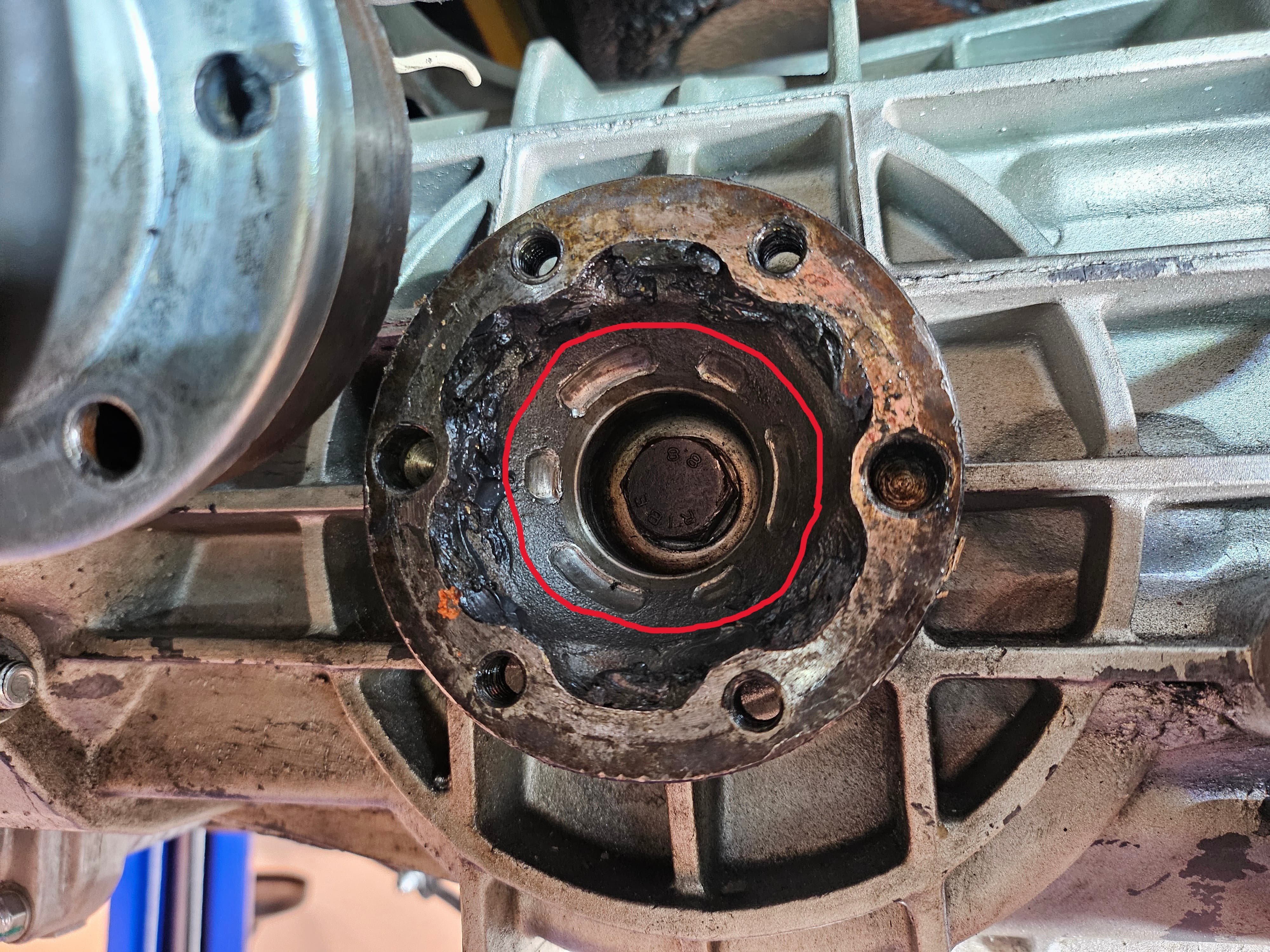 When I removed the inner CV joints from the transaxle flanges, I was surprised to see some pretty deep gouges in the flanges from the CV joint inner race/star (see photos below). This seems like a good candidate for the noise I am hearing. I have never seen this type of wear before with any of the other cars I've worked on - what would cause this? I noticed that there is not much grease in the joints, which I suppose is one possibility. Was the inner race put on backwards? Wrong parts? I did confirm that the axle shaft does move in and out freely at the outer CV joint. Thanks for any insight. Left flange: Right flange: Circled area shows where inner race is cutting into the flange. |