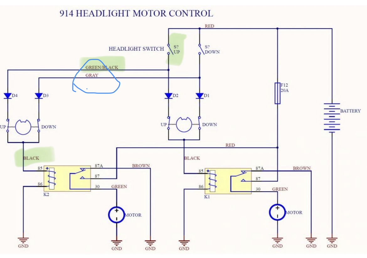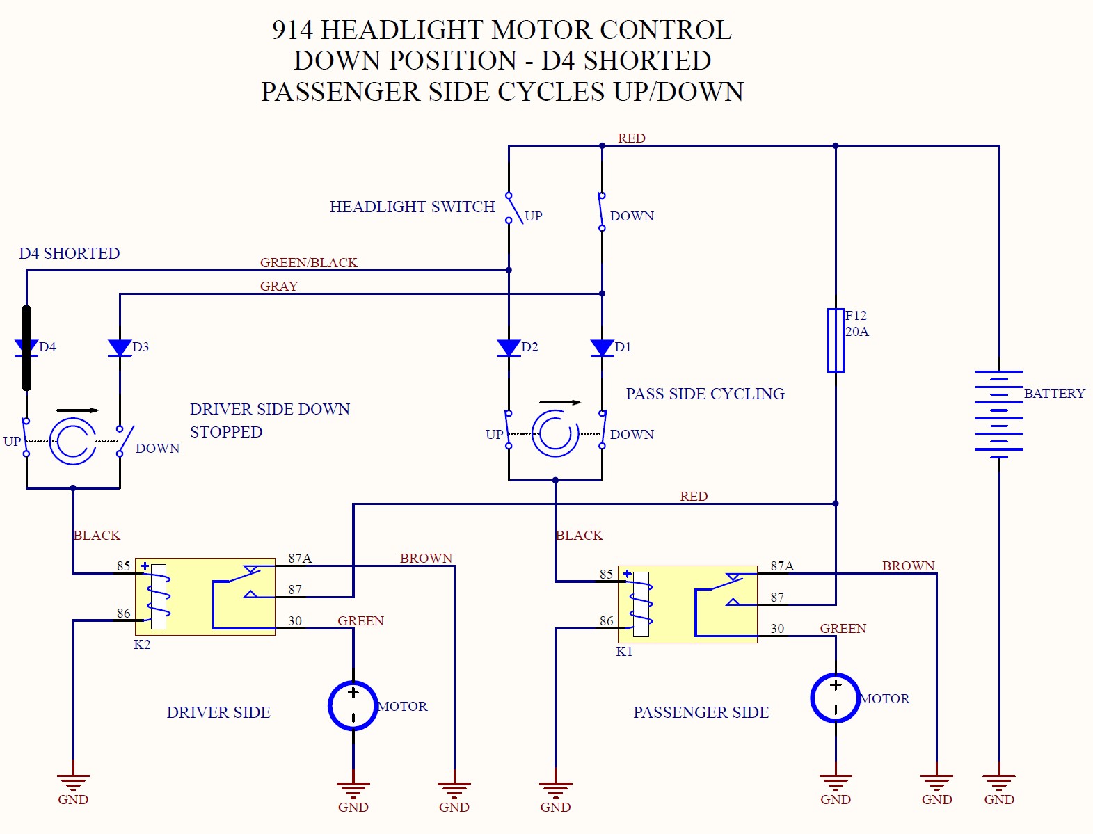 What else could cause the down to skip right through the stop to cycle again? Shorts in the wiring itself. I suspect this is the more likely scenario for the OP. Two problems with my internally shorted diode scenario. 1) Diodes usually fail open. In that case, the up or down function just doesn’t work. 2) When the driver side motor goes to the down position it should open the down rotary switch which itself would keep the current from reverse flowing through to D4. So although the wonky up/down on the passenger side can occur when lights are between fully up/down, it would eventually resolve itself after a few cycles and should not continue indefinitely. For the behavior to continue indefinitely, there would have to be a dual failure of both D4 and the passenger side rotary down switch. Not impossible but not likely either. FIRST, Thanks for HELP Today I did the Test with and without the Relays I reconnect the RED wire to the 3 Connector HLight BATTERY OFF Passenger HLamp DOWN---------------------------------Driver HLamp DOWN BATTERY ON Passenger HL UP & DOWN -continue-------------Driver HLamp DOWN NO Move RELAY Passenger OFF STOP Movement------------------Driver HLamp DOWN NO Move RELAY Passenger IN UP&DOWN restart----------------Driver HLamp DOWN NO Move RELAY DRIVER OFF DOWN NO MOVE-- Passenger HL UP & DOWN -continue- ---------next I have reconnected the relay on the Driver side CAR KEY ON -------- Passenger HL UP & DOWN -continue --------- Driver HLamp DOWN NO Move SWTCH LIGHT in Position Light ----------Passenger HL UP & DOWN -continue ----------Driver HLamp DOWN NO Move SWICH LIGT turned to KIGH Light ----------Passenger UP stable------------------------------Driver UP stable I can go on the road with the TWO DAYLIGHTS that are connected with the POSITION light or with all TWO HLamp UP with SW Light on KIGH Light position - The Problem is that I must disconnect the Passenger RED wire. I have the Head lamp passenger UP& DAWN immediately when the BATTERY is connacted. Thanks for the information. Yes you can drive your 914 with lights on. If you have to stop the engine if you change the headlights to 'parking' the headlights will be off and the pass motor will not cycle. What you observe seems consistent with our thoughts that the pass side relay is not releasing for headlights OFF. |