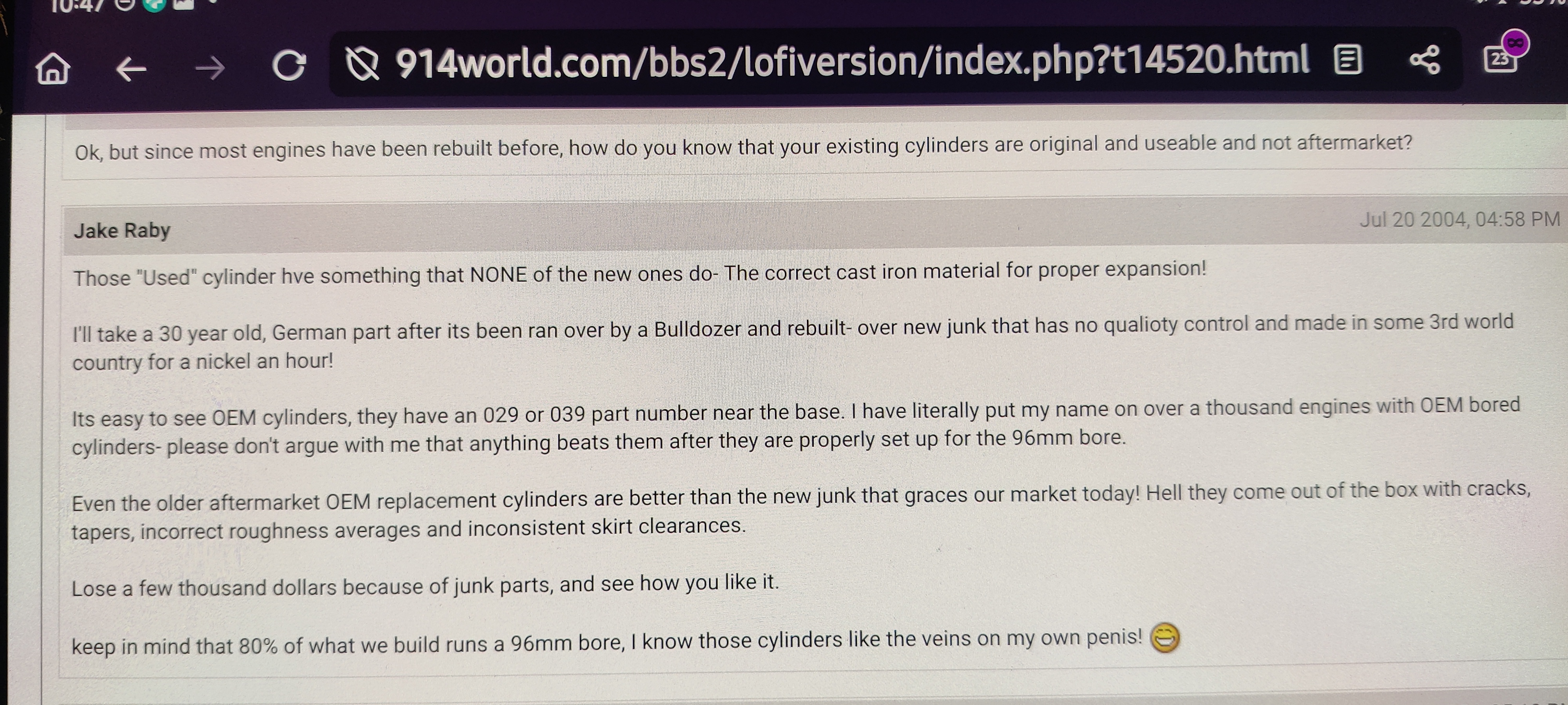 The metallurgy and quality of original cylinders is supposed to be far superior to currently available new cylinders. Don’t take this the wrong way. Where’s the data? We’ve all seen the internet claims but has anyone actually done a metallurgical analysis. I surely haven’t seen it but would love to see it if it exists. Don’t get me wrong there is plenty of crap out there and it’s getting worse but I’ve also seen plenty of crap quality come out of Porsche within recent memory too. Not trying to pick on AA pistons, Porsche or anyone else. There is some insanely high quality metal that comes out of China. It just isn’t cheap and I certainly don’t want to imply that it is in cheap aftermarket parts. In much the same manner, it’s a disservice to say it’s all crap (not what you did - not accusing here). I’m consistently disappointed that the aftermarket doesn’t do a better job of actually specifying what standards their parts meet. It’s usually some generic crap like meets or exceeds OEM standards which is often not quite true. Over 20 years ago, Jake Raby said he had built over a thousand motors using OEM German cylinders. This is all the data we need. So, unless you have data that the Chinese cylinders you can actually find for sale today are as good as OEM German cylinders, we're going to go with the OEM ones. So, to answer the question if those cylinders you have are worth saving. Check for damage and measure them. Attached thumbnail(s) |