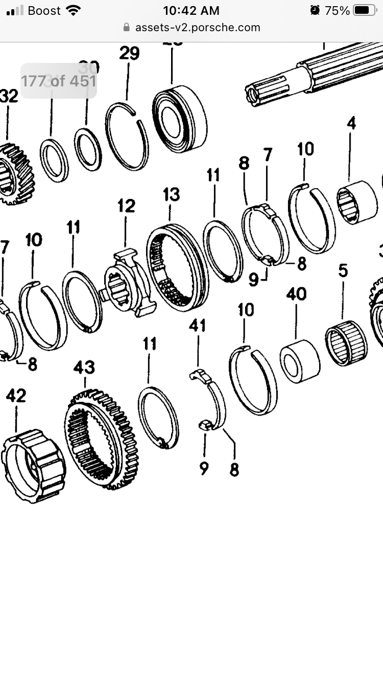 You do know there isn’t any syncro from 2nd to first, you basically have to let the gears mesh up to shift. That is incorrect, there is a synchro on 1st gear. In stock form, it's a different one from the others, but any of the other synchros can be used as long as you use the other parts (e.g., the stop blocks and maybe other stuff) that go with them. A number of old cars do not have synchros on first gear. AFAIK, all Porsches have always had 1st gear synchros. (Possibly some very early 356es did not, but the later ones did!) --DD (IMG:style_emoticons/default/agree.gif) |