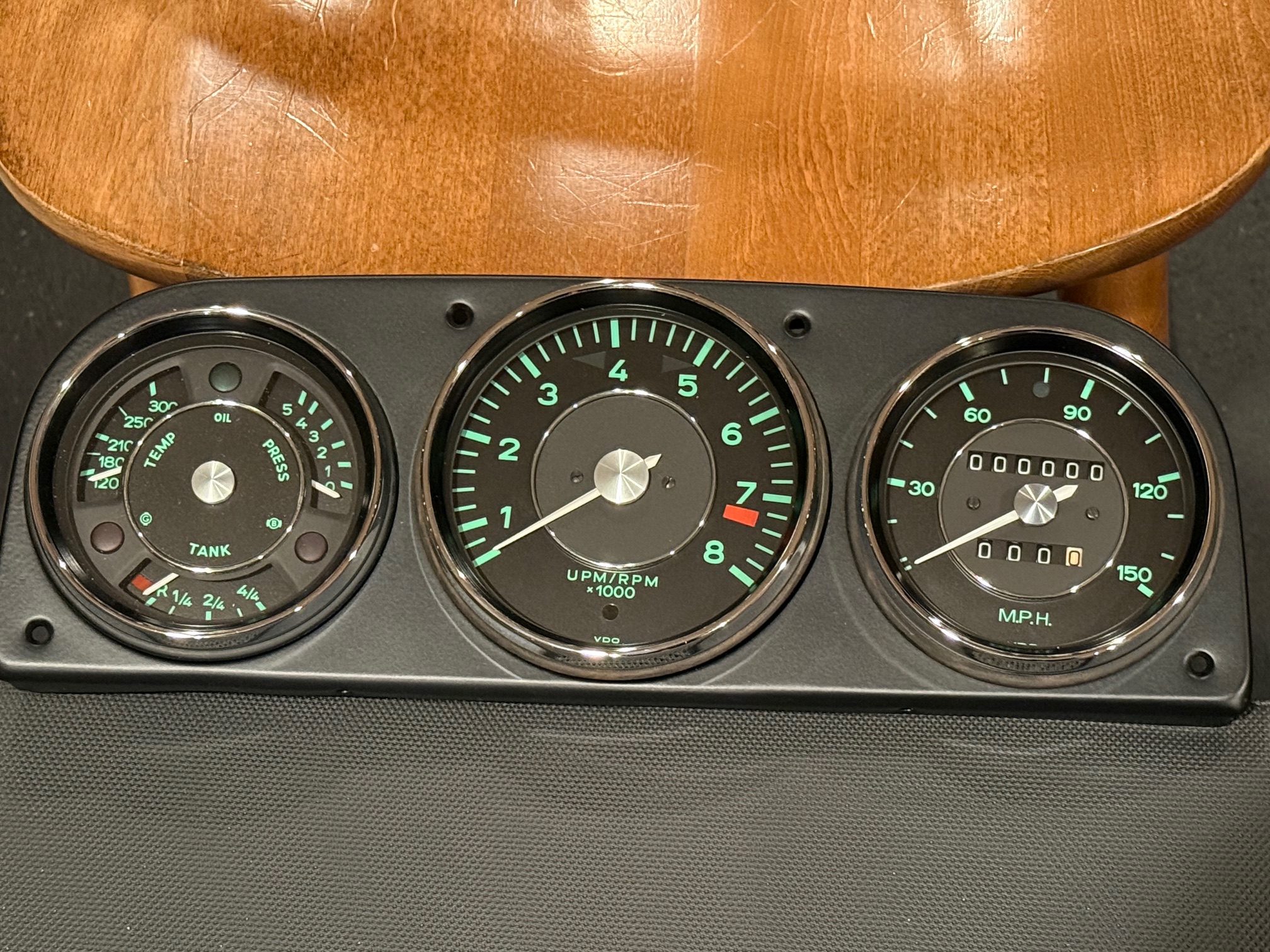I’m lucky to have found John Bell/JBell. He’s now done dozens of gauges for me but I think these are my favorite. Custom triple gauge to match the real green gauge tach. Tach is from a 67S and John just cleaned it up. Engine will redline at 7200. Speedo is a later electronic gauge converted to a green gauge. I hope I can put 100k on the car but it will never roll over like an earlier gauge since it has the extra digit. It was more than just changing the face to green. John made some custom pieces to fit the extra digit around the chrome ring and moved the odometer reset knob off the face of the gauge and placed it underneath like an early gauge. I believe it was the first one that John did like this and he nailed it. I don’t think the trans is set up with the correct sensor so if not, I’ll follow Clay’s lead and plug in a gps receiver. @JBell