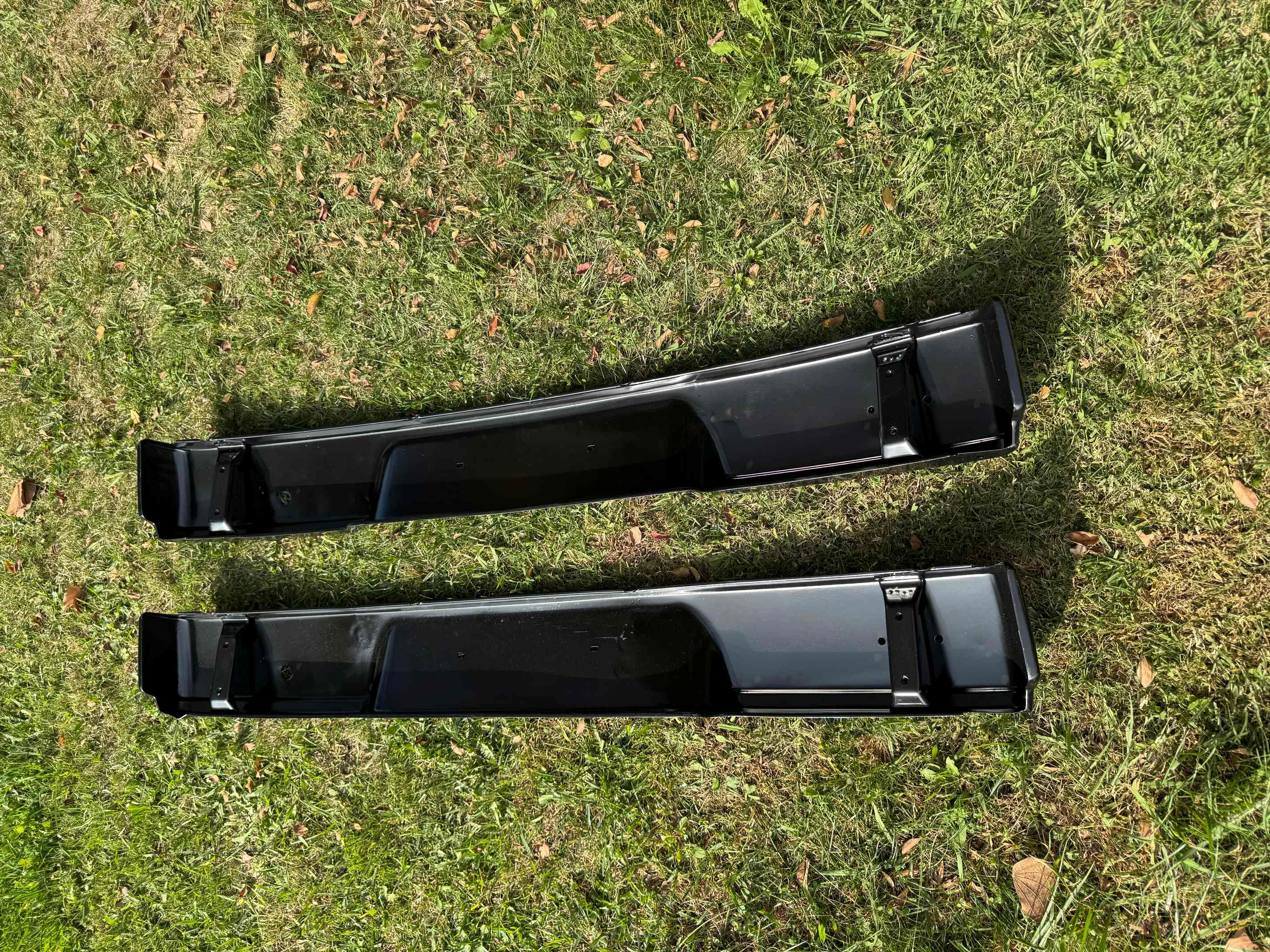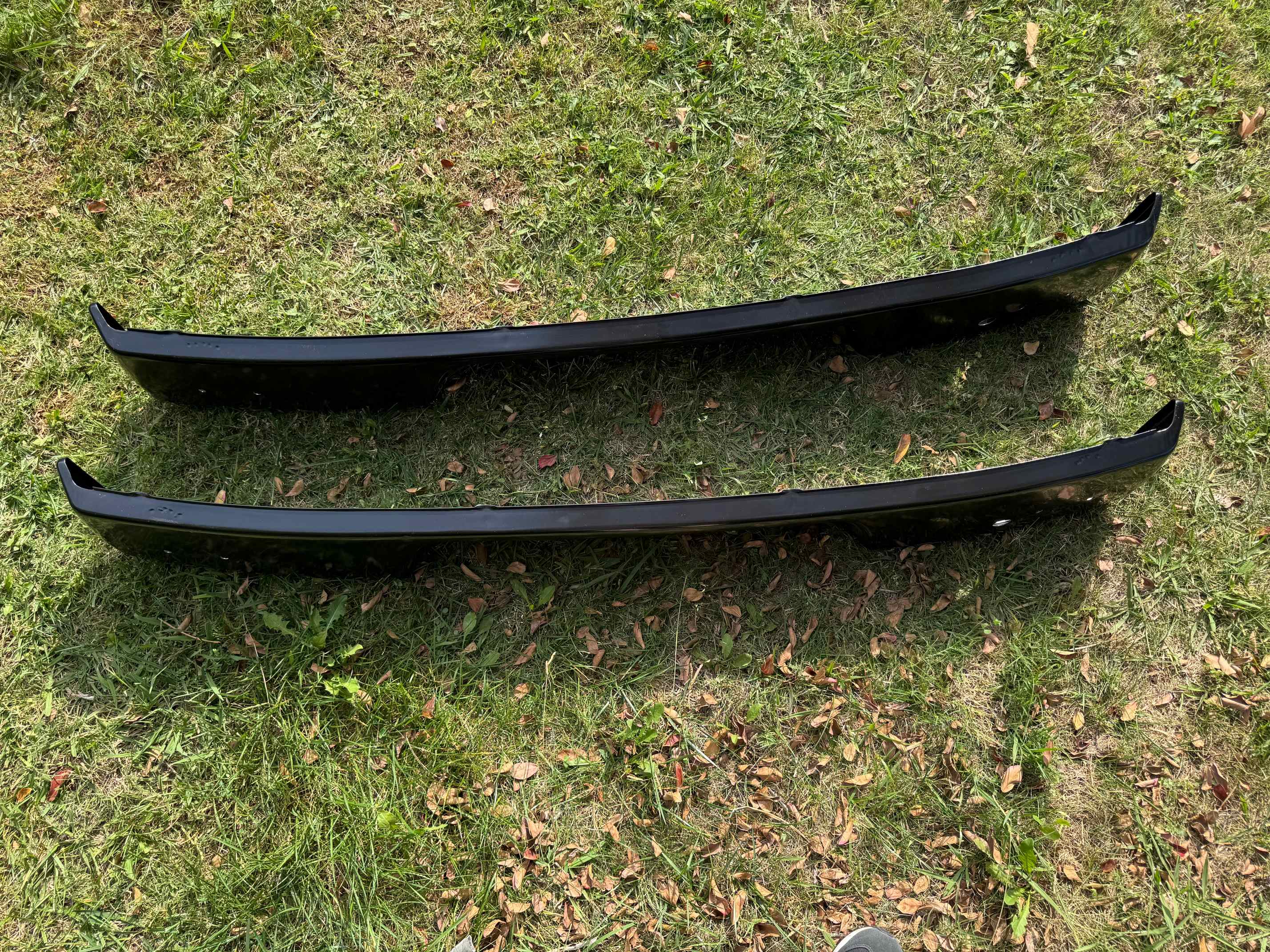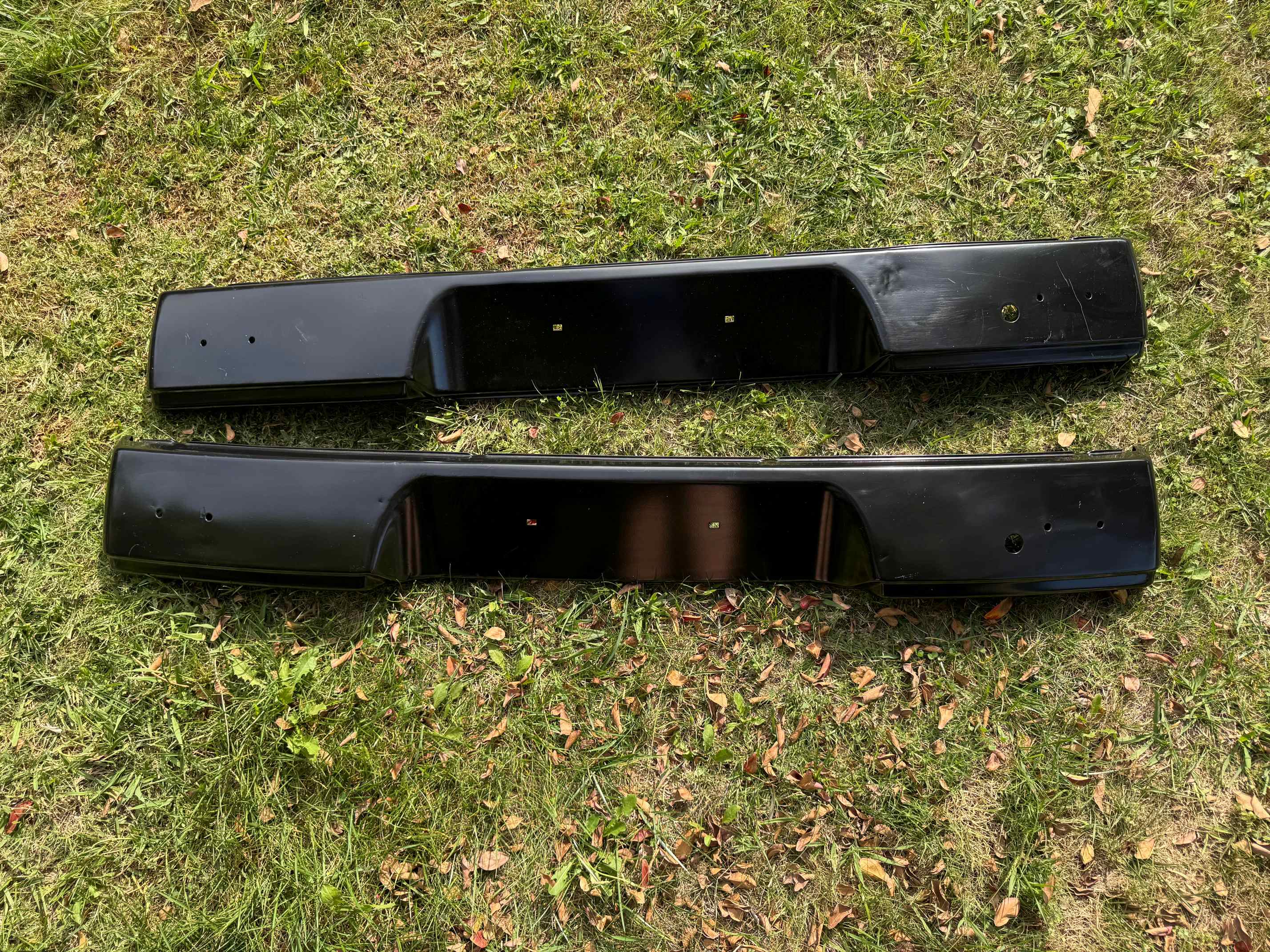 Both of these bumpers have holes for bumperettes. Both have been blasted and powder coated, but both should have had some dents removed prior to powder coating. One has more dents than the other.