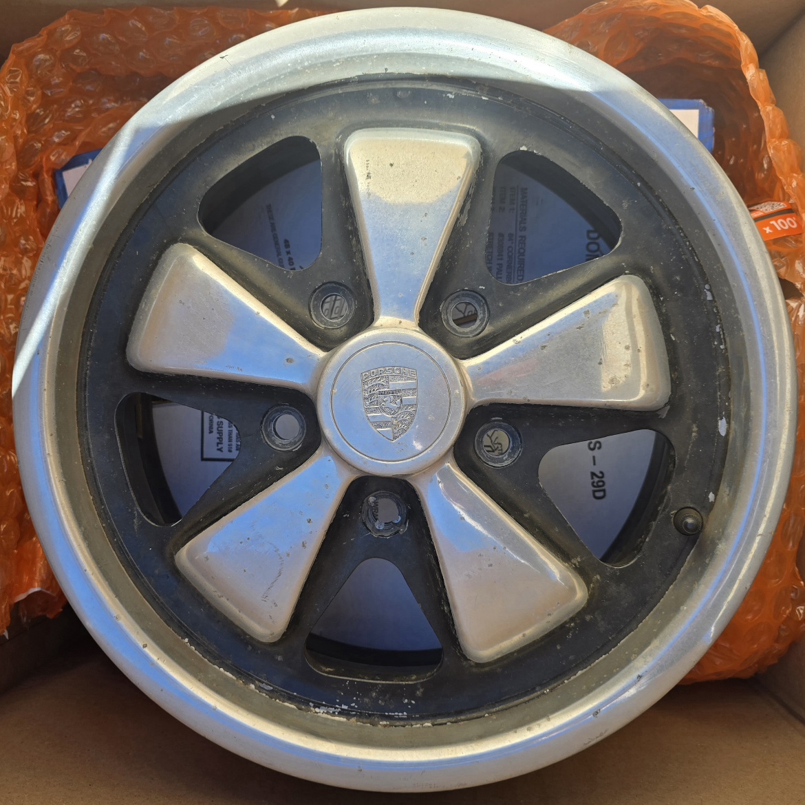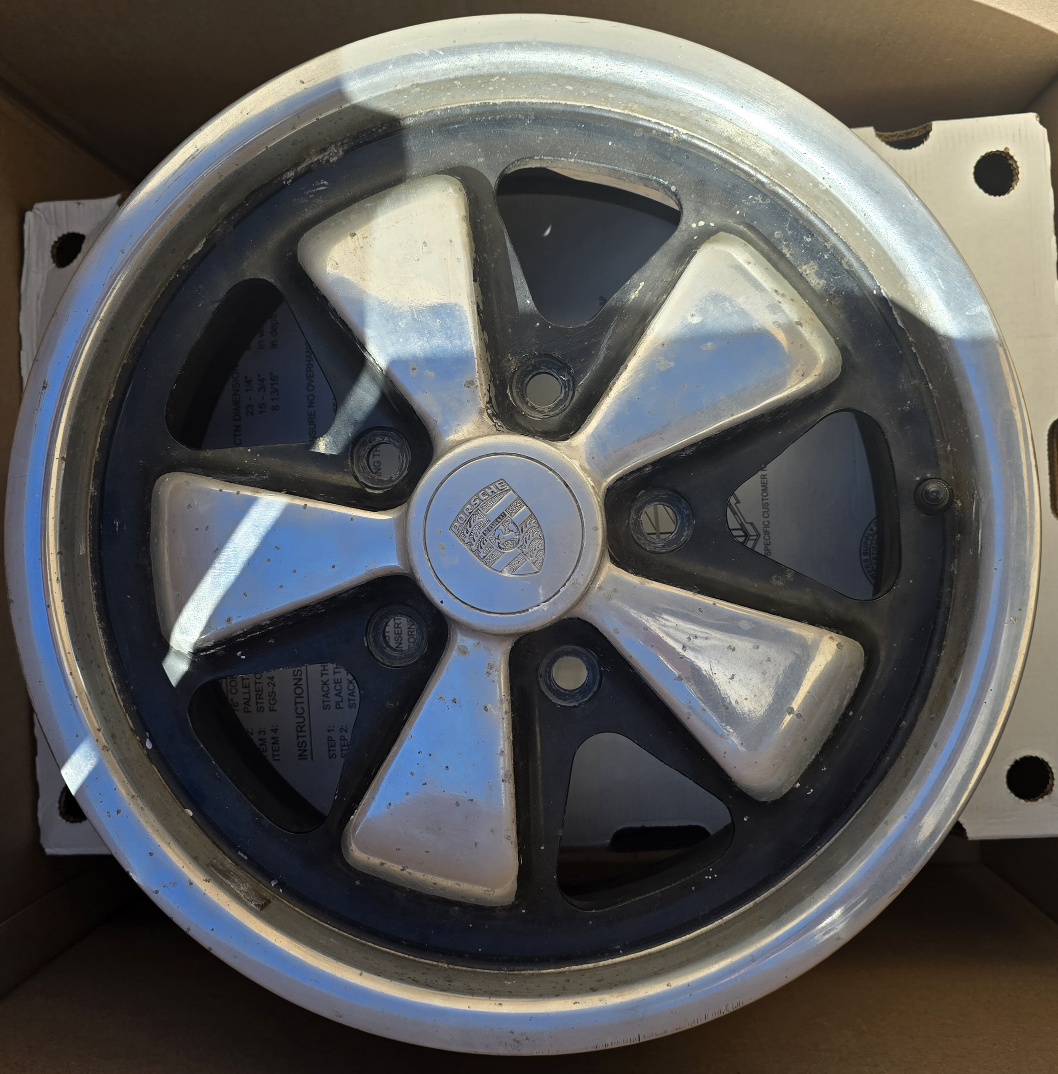 I have 14" Fuchs on my 914 now and had been considering stepping up to 15 x 6 (front) and 15x7 (rear) maxilites with the RSR finish. I was about to pull the trigger and stumbled upon some date matched (9/72) 15x6 Fuchs wheels.