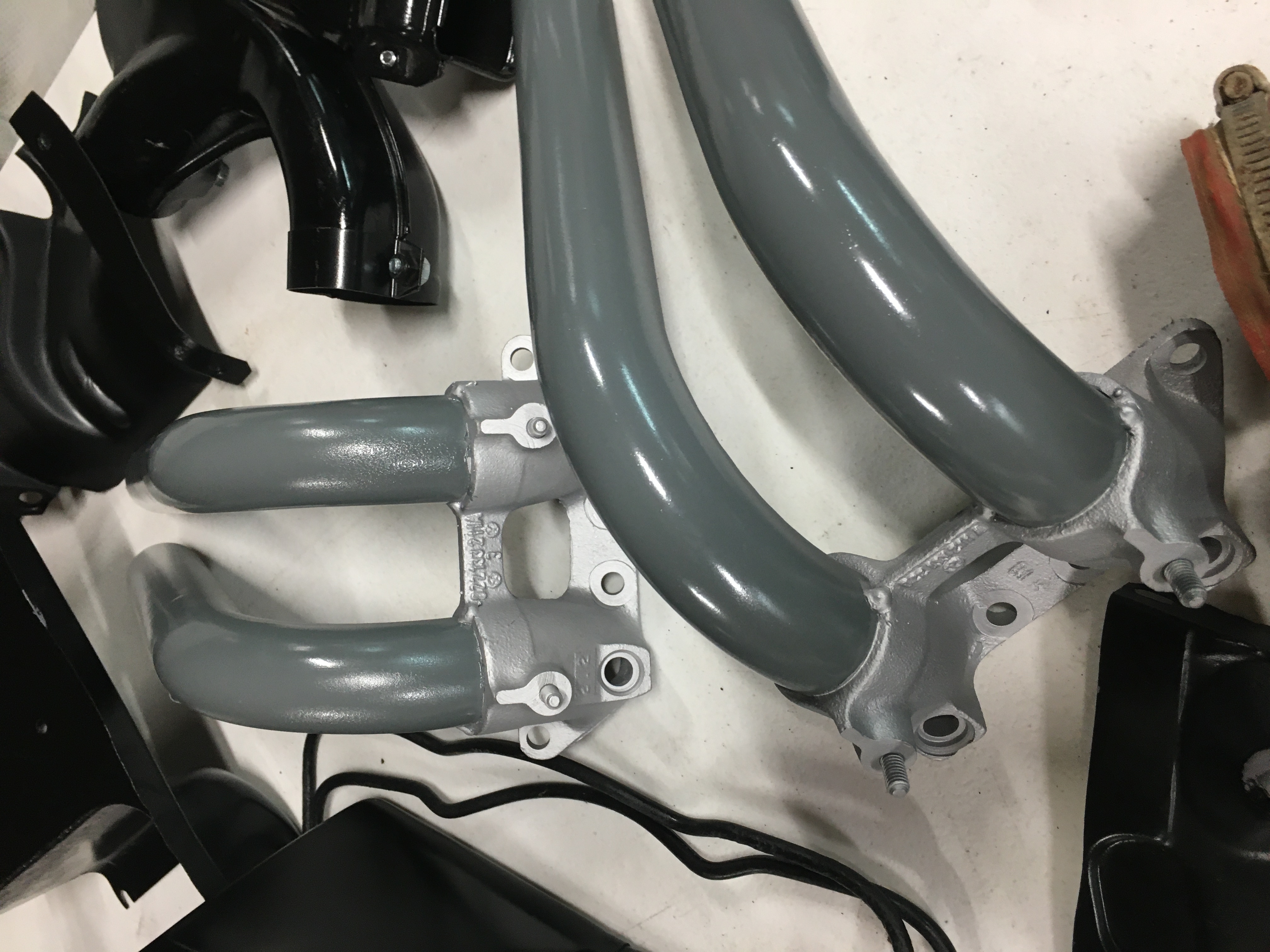 The HEs, most of the heat ducting and intake manifolds (all the same coating) are high heat conditions, the coating must resist high temps and its a matte gloss finish: (IMG:style_emoticons/default/agree.gif) def matt finish on intake runners originally. i'd have to do more research to be 100% sure but i would not mind betting the orig factory paint finish on exhaust, mufflers, heat exchangers etc was the same L249 color as the intake runners as well. maybe a different composition paint ??? but was same color i feel. |