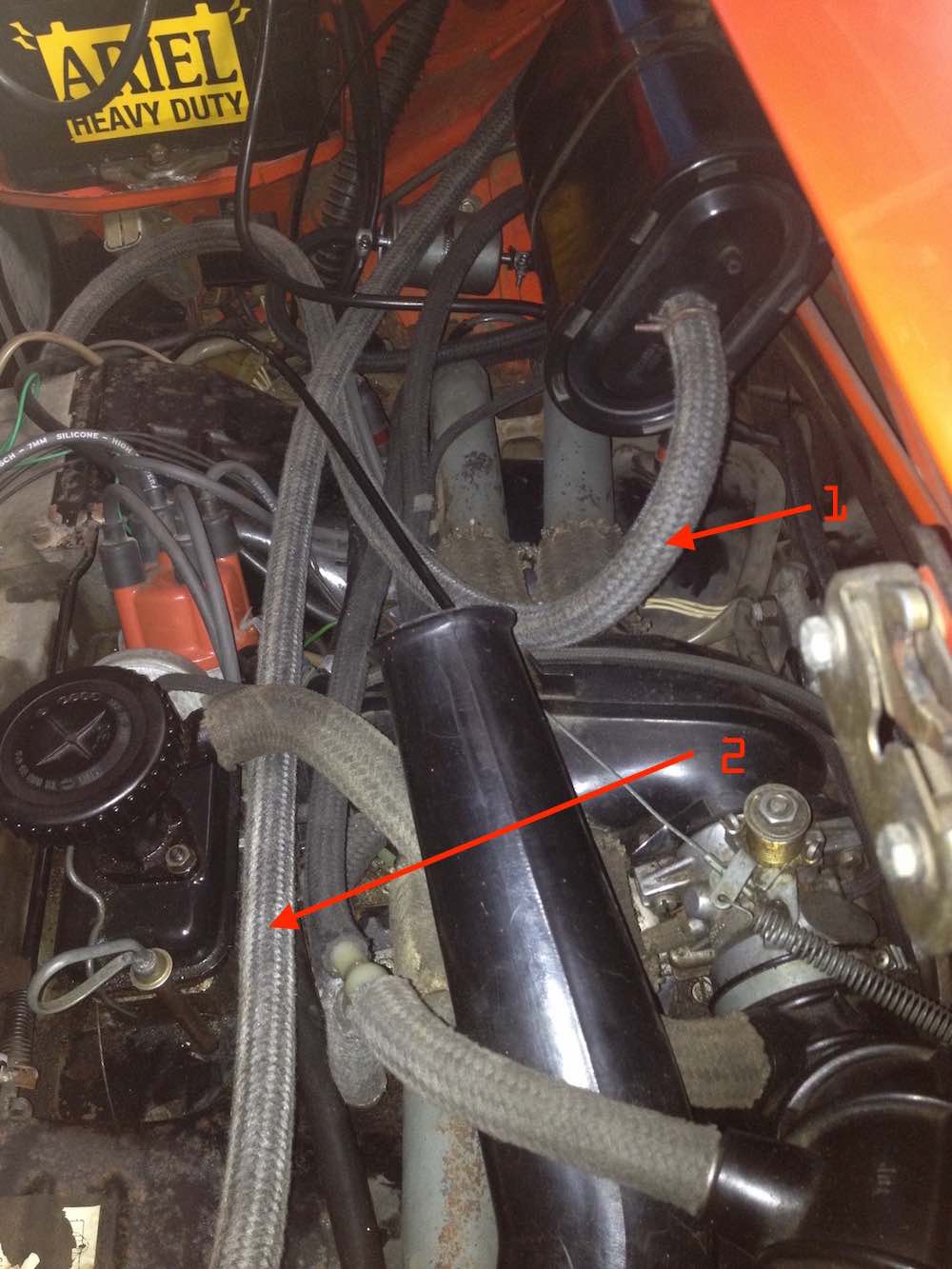 Thanks Garland: Those do look nice! I thought I had a solution, found a paint store that will custom mix automotive paint in a rattle can. Only to find out that they need a large flat space to scan for the correct color. So, went to Sherwin and found swatches that seemed really close that they could scan. Only then I didn't know whether to use the faded runner color or the color that was under the connecting hoses. I'm liking the Ford gray. Need to keep moving.