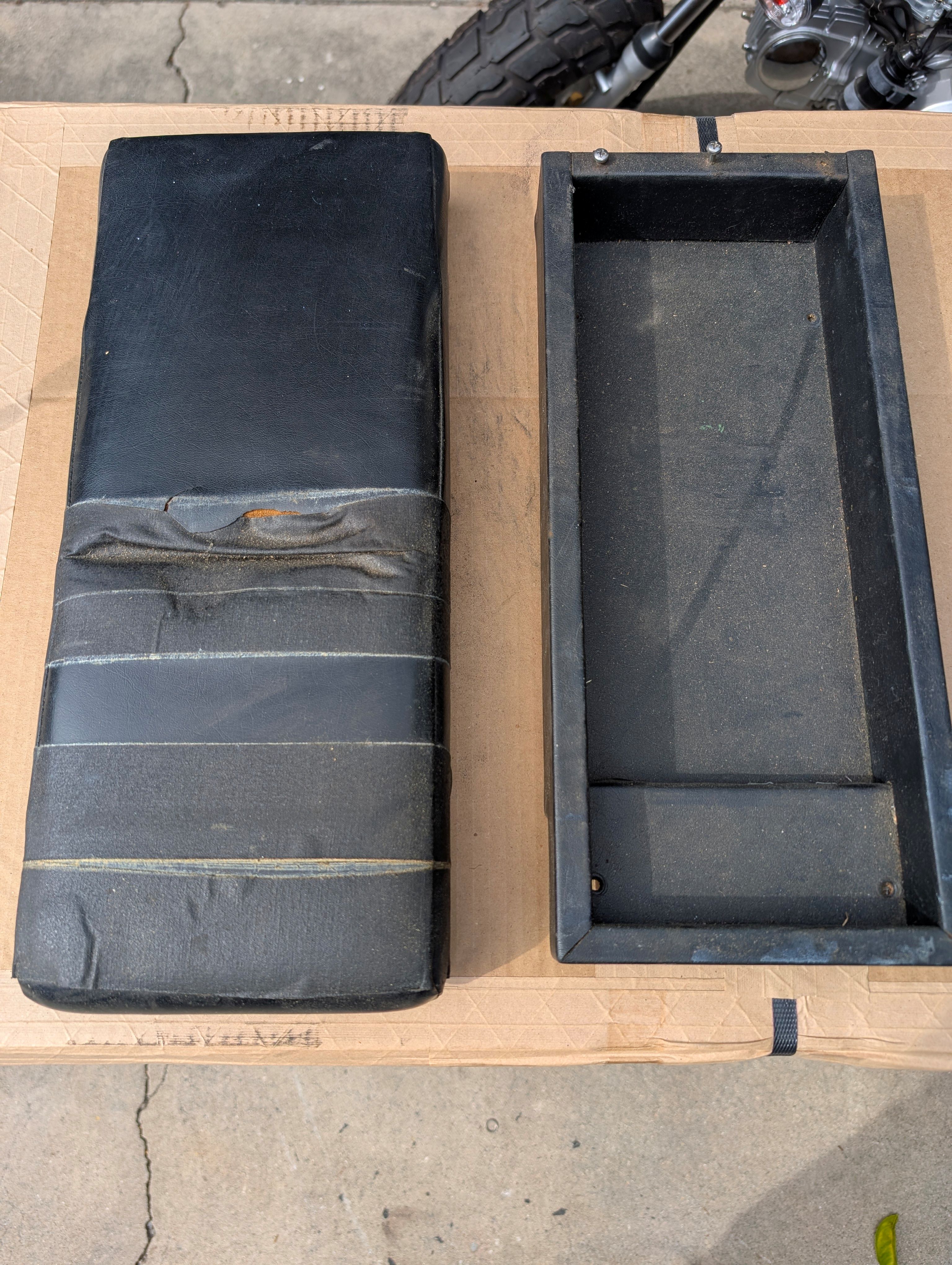 Cleaning out some of my last 914 parts after selling my '74. This is an arm rest center console (between seats) that came with my 74 but I never installed. The lower section / storage box is in very good condition. The wood is solid and the vinyl on the lower part is in good shape. The upper cushion foam is in good condition however the vinyl is obviously torn and covered with tape. I believe you can buy replacement upholstery for the top.